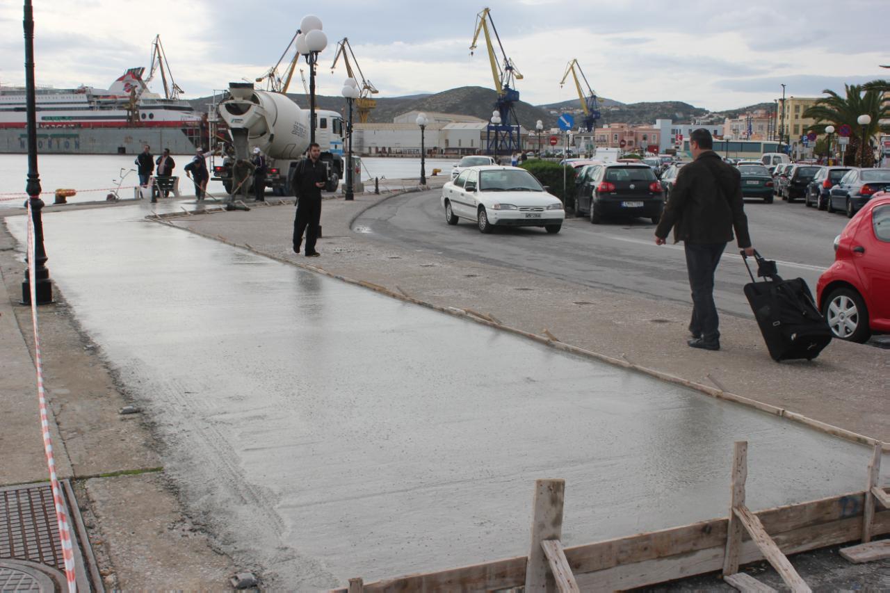 Ξεκίνησαν εχθές το πρωί οι εργασίες επίστρωσης του πεζοδρομίου από την έξοδο του λιμένα της Σύρου μέχρι και τη στάση του mini – bus επί της Εθνικής Αντιστάσεως. Το έργο υλοποιείται από το Λιμενικό Ταμείο Σύρου με στόχο τη διευκόλυνση των επιβατών, οι οποίοι είτε απομακρύνονται είτε κατευθύνονται στο λιμάνι για την αναχώρηση του πλοίου τους. Σημειώνεται ότι η προηγούμενη κατάσταση του πεζοδρομίου, το οποίο είχε αφεθεί κυριολεκτικά στη φθορά του χρόνου με τις πέτρες από το “φαγωμένο” τσιμέντο να προεξέχουν δημιουργούσε τεράστιο πρόβλημα στη διέλευση του κόσμου, καθώς και στην μεταφορά των αποσκευών του.