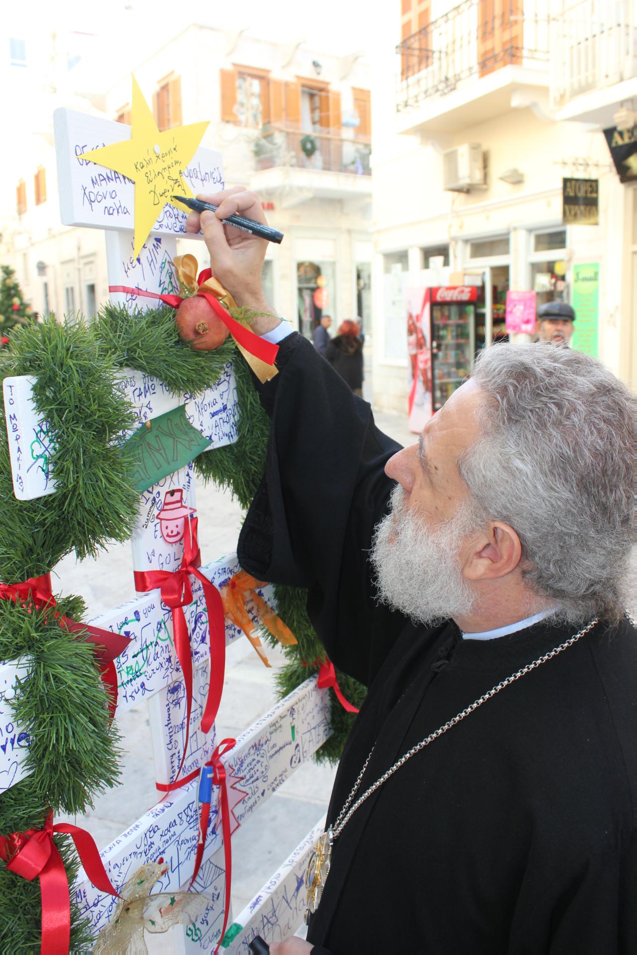Με την εκτίμηση ότι η πίστη και η αγάπη είναι τα απαραίτητα εφόδια για να διακρίνει κανείς ότι πίσω από την καταχνιά υπάρχει πάντα το φως, ο κ. Δωρόθεος δώρισε στους καταστηματάρχες το καθιερωμένο Χριστόψωμο, ένα από τα ομορφότερα έθιμα των άγιων αυτών ημερών. Παράλληλα, ευχήθηκε σε όλους το νέο έτος 2014 να φέρει την ελπίδα στην καρδιά μας, την αισιοδοξία στα παιδιά μας και το χαμόγελο στα πρόσωπά μας, ενώ δεν παρέλειψε να γράψει τις ευχές του και στα ξύλινα Χριστουγεννιάτικα δέντρα που έχουν στηθεί στον πεζόδρομο του νησιού.