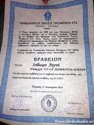 Όπως αναφέρεται στο www.ellinikiaktoploia.net, η Ένωση βράβευσε τον καπετάν Ισίδωρο Λιγνό, τιμώντας για τον επαγγελματισμό και την αυτοθυσία που επέδειξε και συνεχίζει να επιδεικνύει, προσφέροντας τις υπηρεσίες του στη δύσκολη αυτή γραμμή.
