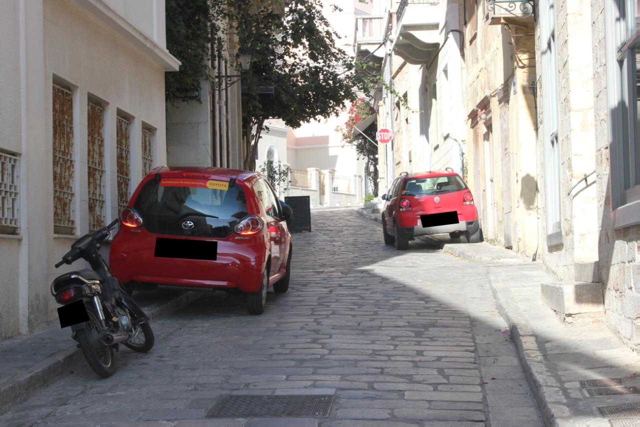 Το πρόβλημα δεν είναι εμφανές μόνο στους κεντρικούς δρόμους της πόλης, αλλά και σε γειτονιές της Ερμούπολης, όπου η διέλευση των πεζών καθίσταται πολλές φορές δύσκολη εξαιτίας των οχημάτων, που βρίσκονται παρκαρισμένα είτε επάνω στα πεζοδρόμια, είτε μπροστά από σκαλιά, είτε σε πλακόστρωτα δρομάκια που δεν ενδείκνυνται για στάθμευση οχημάτων.