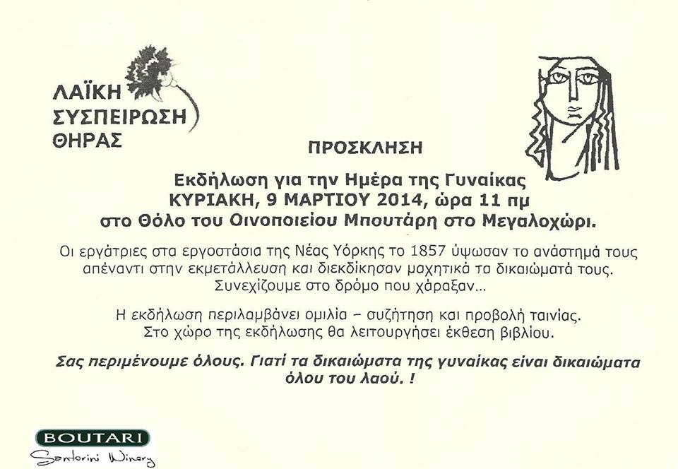 Με αφορμή λοιπόν την ημέρα της Γυναίκας θα πραγματοποιηθεί τη Κυριακή 9 Μαρτίου 2014 στις 11π.μ. στο Θόλο του Οινοποιείου Μπουτάρη στο Μεγαλοχώρι της Σαντορίνης, εκδήλωση για να τιμήσουν τη γυναίκα όπως της αξίζει. Η διοργάνωση θα γίνει μετά από πρωτοβουλία της Λαϊκής Συσπείρωσης της Θήρας, σε μια προσπάθεια να μην λησμονηθούν οι μέρες εκείνες πού οι εργάτριες της Νέας Υόρκης στα τέλη του ‘50 ύψωσαν το ανάστημα τους και διεκδίκησαν καλύτερες συνθήκες εργασίας.