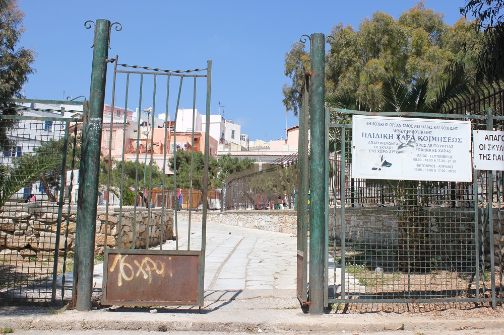 Παράλληλα, θα πρέπει να ληφθεί υπόψη ότι η συγκεκριμένη παιδική χαρά “συνορεύει” με το 2ο Δημοτικό Σχολείο Ερμούπολης, ο οποίος χρησιμοποιεί τμήμα του για το μάθημα της φυσικής αγωγής. Το γεγονός αυτό καθιστά πιο επιτακτική την ανάγκη συντήρησης, περίφραξης αλλά και συχνότερης καθαριότητας του χώρου, καθώς πολλές φορές “καταλαμβάνεται” από αδέσποτα ζώα και κατοικίδια, με αποτέλεσμα να μετατρέπεται σε “ναρκοπέδιο” για τα παιδιά που τον επισκέπτονται.