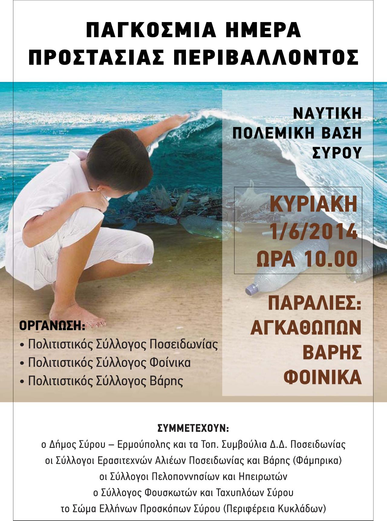Στο πλαίσιο του εορτασμού της παγκόσμιας ημέρας προστασίας του περιβάλλοντος τη Κυριακή 01 Ιουνίου 2014 η Ναυτική Πολεμική Βάση Σύρου διοργανώνει ημέρα καθαρισμού των παραλιών των Αγαθωπών, του Φοίνικα και της Βάρης σε συνεργασία με τους πολιτιστικούς συλλόγους Ποσιεδωνίας, Φοίνικα και Βάρης.