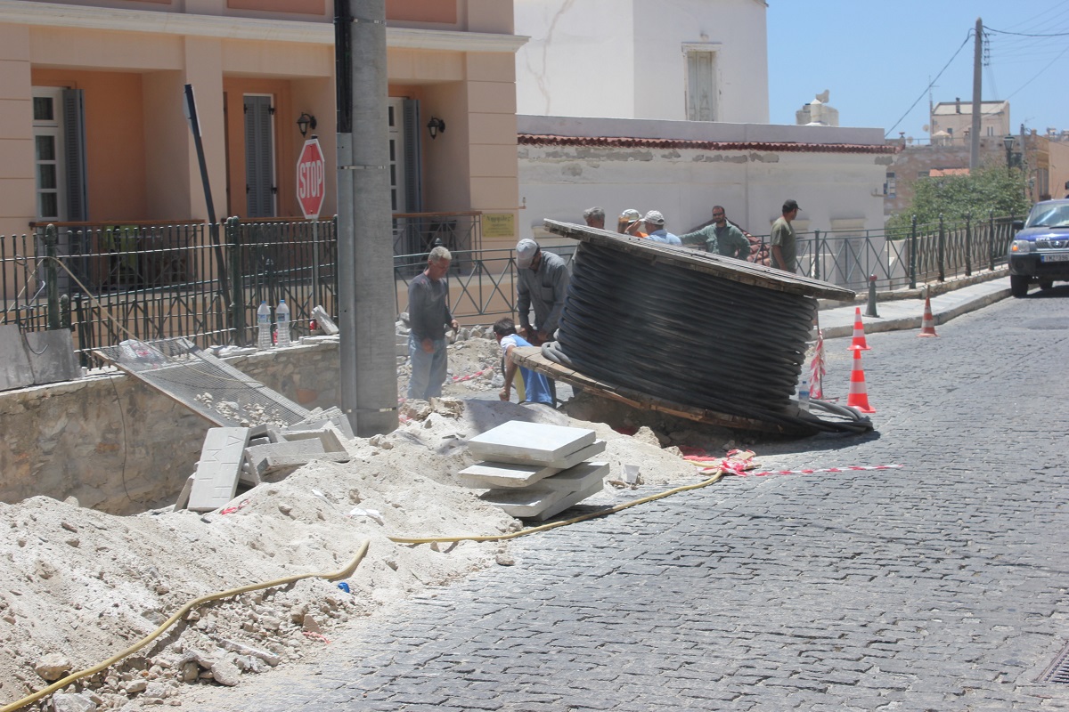 Σύμφωνα με πληροφορίες της εφημερίδας, πρόκειται για εργασίες σε υπόγεια καλώδια της ΔΕΗ, στο ύψος που βρίσκεται το κτίριο που στεγάζεται η Αστυνομική Διεύθυνση Κυκλάδων και οι οποίες απαίτησαν την αφαίρεση των πλακών σε ένα μεγάλο τμήμα του πεζοδρομίου ώστε να προχωρήσουν απρόσκοπτα οι διορθωτικές παρεμβάσεις. Διευκρινίζεται, ότι το συγκεκριμένο έργο αναμένεται άμεσα να ολοκληρωθεί αφού δεν συνδέεται με το έργο υπογειοποίησης καλωδίων της ΔΕΗ σε εκείνο το σημείο για το οποίο έχει γνωμοδοτήσει θετικά και το δημοτικό συμβούλιο, ενώ αξίζει να τονισθεί, πως οι εργασίες δεν ευθύνονται για τις διακοπές ρεύματος που παρατηρήθηκαν στον Ερμούπολη, γεγονός που οι ίδιες πληροφορίες θέλουν να είναι συγκυριακό.