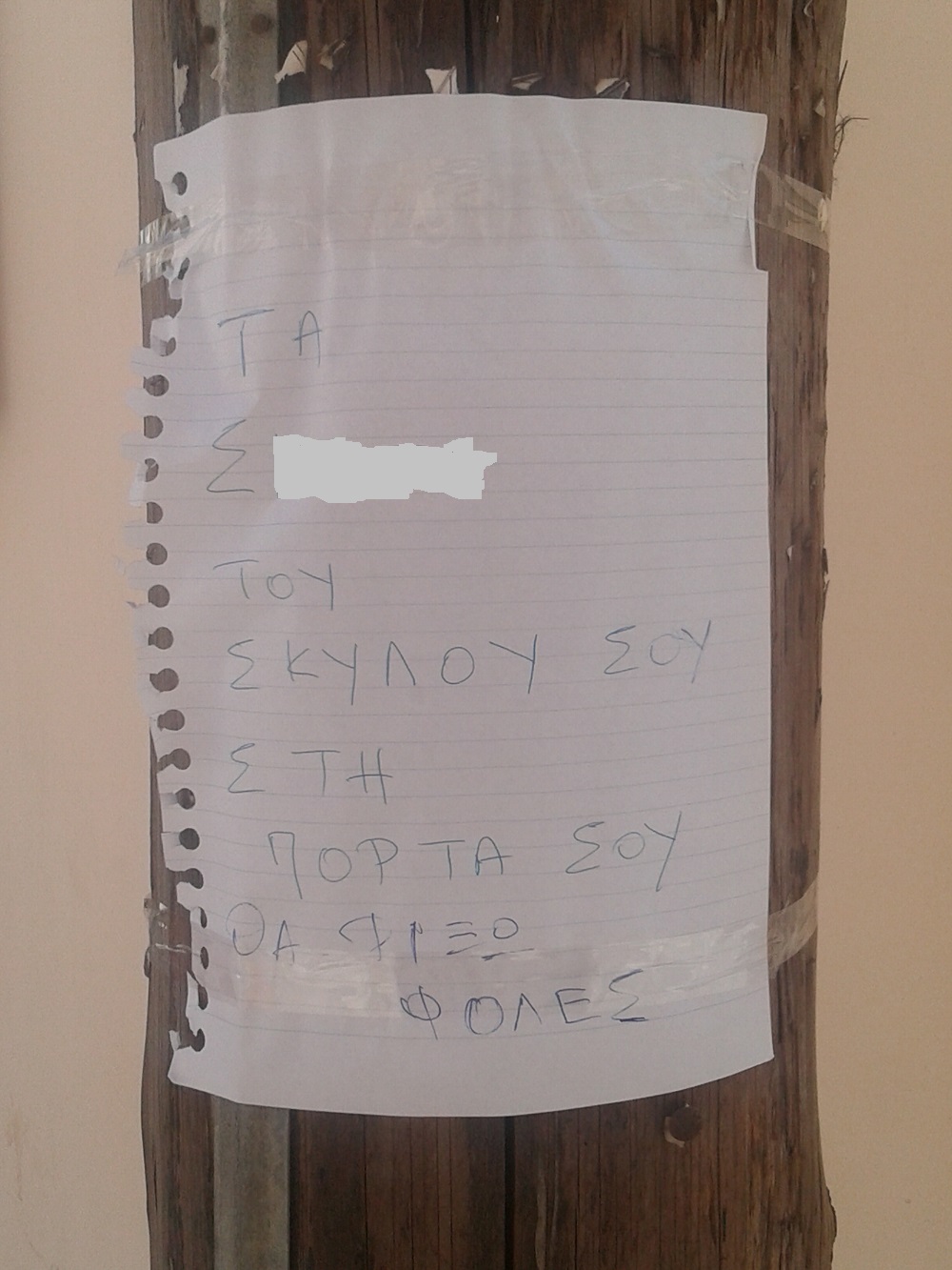 Σύμφωνα με καταγγελία της κ. Ανεζίνας Βουρλάκου στην “Κοινή Γνώμη”, κάτοικος της περιοχής, ενοχλημένος από τα περιττώματα σκύλων, τα οποία δεν συλλέγονται από τους ιδιοκτήτες τους, εξέφρασε την αγανάκτησή του, τοιχοκολλώντας χειρόγραφο σημείωμα με το οποίο προειδοποιούσε τους γείτονές του για τις προθέσεις του στην περίπτωση που δεν συμμορφωθούν.