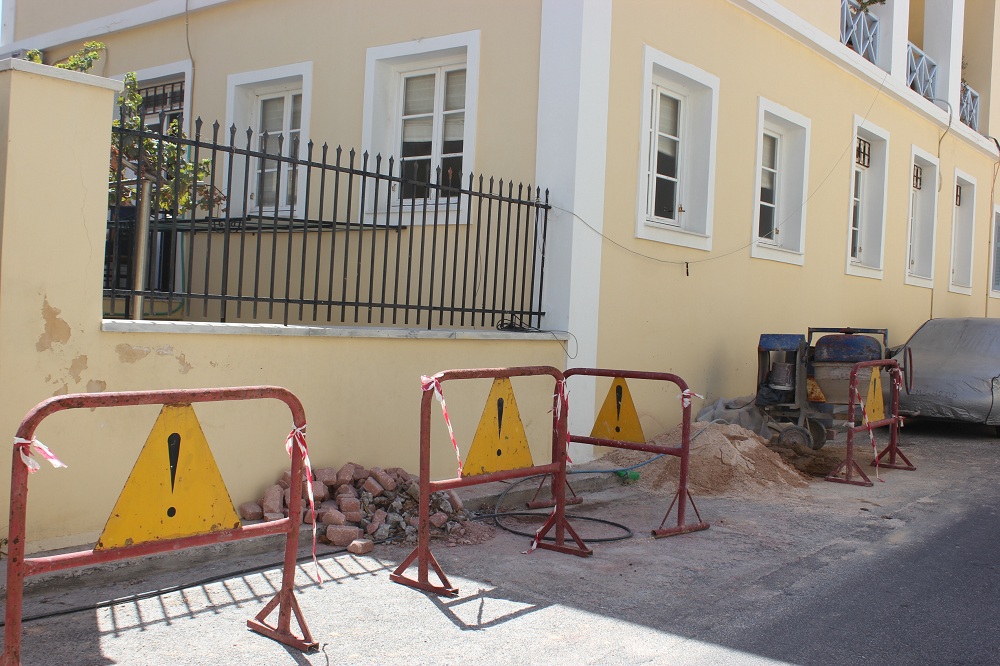 Εργασίες συντήρησης του δαπέδου του αύλειου χώρου του ΚΑΠΗ Ερμούπολης που βρίσκεται στη συμβολή των οδών Κωνσταντίνου Μαρούλη και Μαυρομουστάκη πραγματοποιούνται εδώ και λίγες ημέρες με σκοπό την αποκατάστασή του.