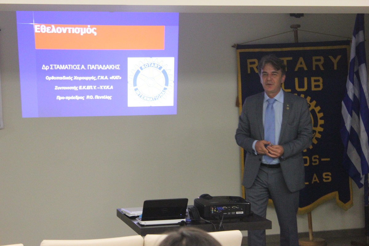 Στην ομιλία του, ο κ. Παπαδάκης, ο οποίος έχει συμμετάσχει σε πλήθος εθελοντικών συμμετοχών στο εσωτερικό και στο εξωτερικό, τόσο μέσω του Ρόταρυ όσο και του Υπουργείου Υγείας εξήγησε ότι ο εθελοντισμός είναι η ηθελημένη παροχή υπηρεσιών για κάποιον κοινωφελή σκοπό, που συνδέεται με την αλληλεγγύη προς τους συνανθρώπους μας και την ανιδιοτελή προσφορά. Διακρίνεται στον επίσημο εθελοντισμό, υπό τη σκέπη μιας οργάνωσης ή ενός ιδρύματος και στον ανεπίσημο ή άτυπο, όταν η προσφορά γίνεται περισσότερο σε προσωπικό επίπεδο.