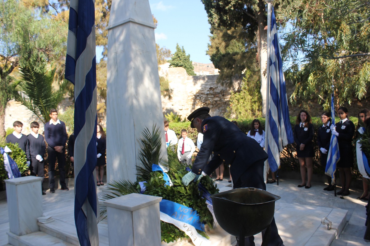 Μετά το πέρας της δοξολογίας ακολούθησε επιμνημόσυνη δέηση στο μνημείο Θυμάτων Κατοχής (Κτήμα Χαρτουλάρη) και κατάθεση στεφάνων από τους εκπροσώπους των τοπικών αρχών και μαθητές του 6ου Δημοτικού Σχολείου Ερμούπολης, του 1ου Γυμνασίου και Γενικού Λυκείου Σύρου. Στη συνέχεια τηρήθηκε ενός λεπτού σιγή, ενώ οι εκδηλώσεις ολοκληρώθηκαν με την ανάκρουση του Εθνικού Ύμνου από τη Φιλαρμονική του Δήμου Σύρου – Ερμούπολης.