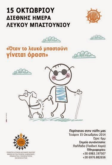 Στο πλαίσιο της Διεθνούς ημέρας για το λευκό μπαστούνι, το Σωματείο Α.με.Α Τήνου διοργανώνει την Τετάρτη 15 Οκτωβρίου στις 18:00 έναν περίπατο,βιωματικού χαρακτήρα στο κέντρο του νησιού. Μετά την προγραμματισμένη διαδρομή, η οποία στόχο έχει την μετατροπή του λευκού μπαστουνιού σε όραση, θα ακολουθήσει συζήτηση προκειμένου να μοιραστούν τα άτομα που θα συμμετάσχουν στην εκδήλωση την εμπειρία που βιώσανε και τα συναισθήματα τους κατά τη διάρκεια του περιπάτου. Ο περίπατος θα πραγματοποιηθεί στην Παλλάδα, όπου θα είναι η αφετηρία του.