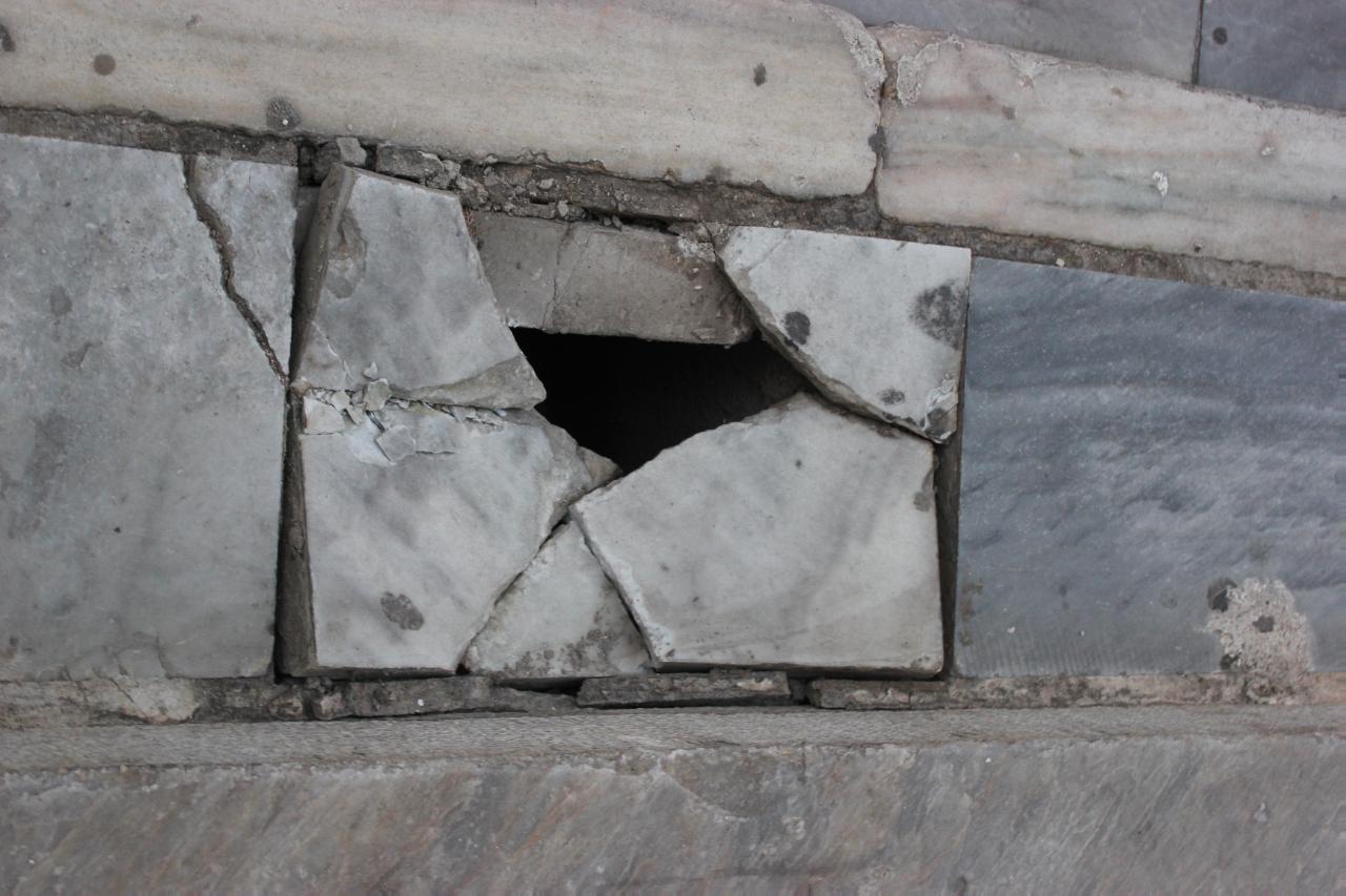 Αποκολλημένα κομμάτια από τις μαρμάρινες πλάκες του πεζοδρομίου της οδού Γεωργίου Σουρή, αφήνουν ακάλυπτα βαθιά κενά.