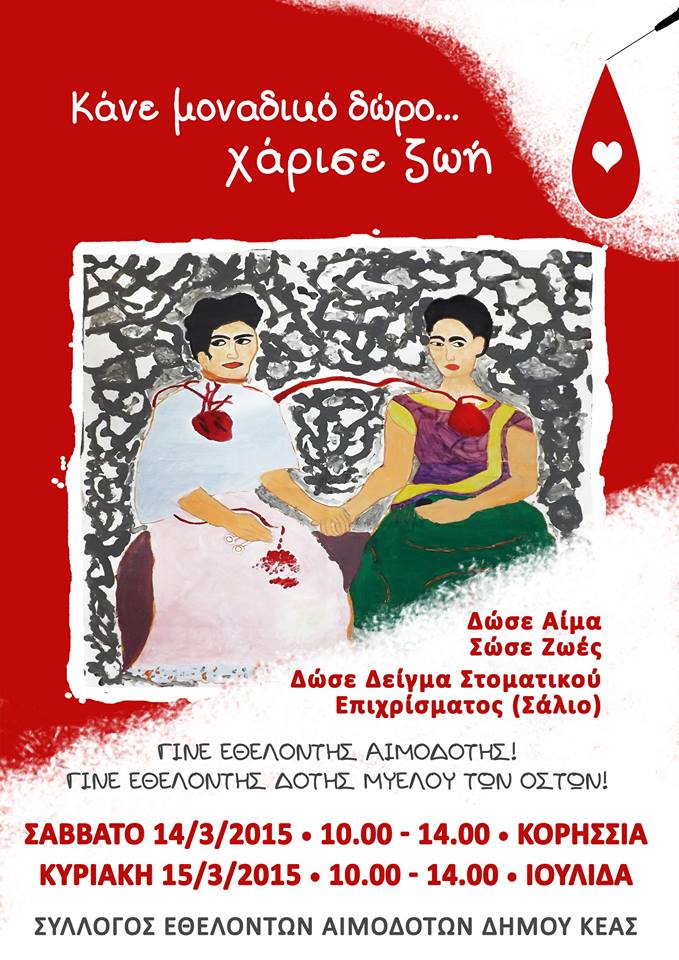 Σημειώνεται ότι θα πραγματοποιηθεί εθελοντική αιμοδοσία το Σάββατο 14 Μαρτίου 2015 και ώρες 10:00 – 14:00 στην Κορησσία και την Κυριακή 15 Μαρτίου 2015 από τις 10 το πρωί έως τις 2 το μεσημέρι στην Ιουλίδα.