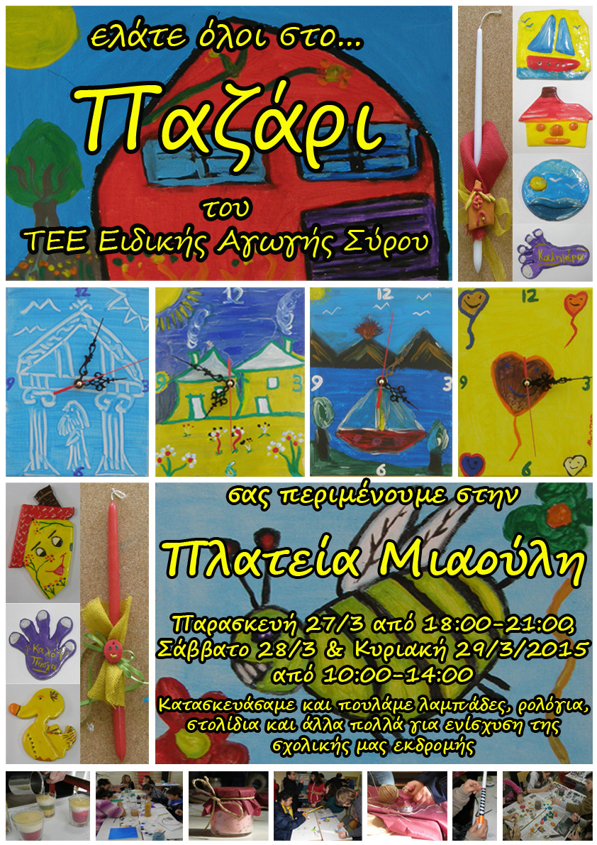Το παζάρι θα πραγματοποιηθεί την Παρασκευή 27/03/2015 από τις 18:00-21:00, το Σάββατο 28/03/2015 και την Κυριακή 29/03/2015 από τις 10:00-14:00 στην πλατεία Μιαούλη, με σκοπό την οικονομική ενίσχυση της σχολικής εκδρομής τους.