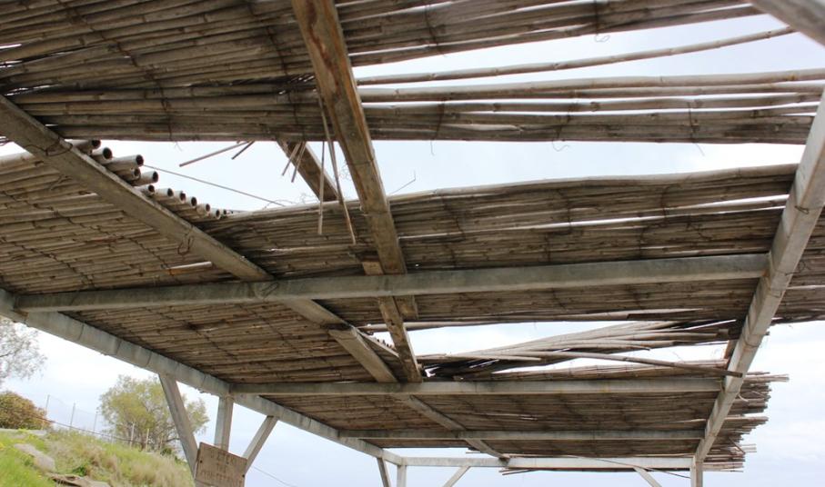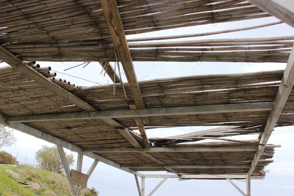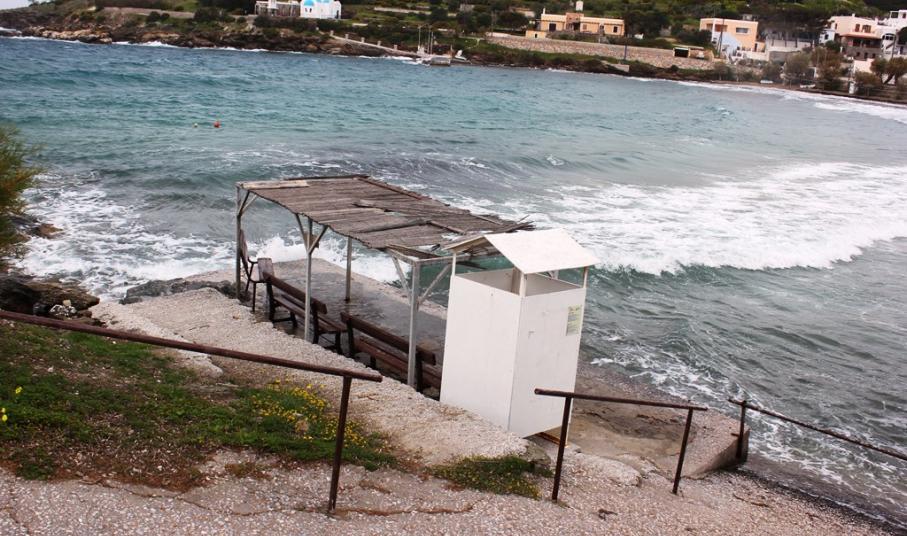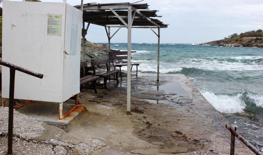 Όπως φαίνεται και στις φωτογραφίες, τα μεταλλικά μέρη στον θαλαμίσκο του αποδυτηρίου έχουν σκουριάσει, όπως και αυτά στα παγκάκια, ενώ το ξύλινο μέρος τους φέρει μικροφθορές. Παράλληλα, τα καλάμια που χρησιμοποιήθηκαν για την κατασκευή του στεγάστρου έχουν σπάσει και αποκολληθεί, λόγω των ισχυρών ανέμων. Σκουριασμένα και ασυντήρητα δείχνουν και τα κάγκελα, τα οποία είναι τοποθετημένα στην άκρη του δρόμου που οδηγεί στο σημείο.