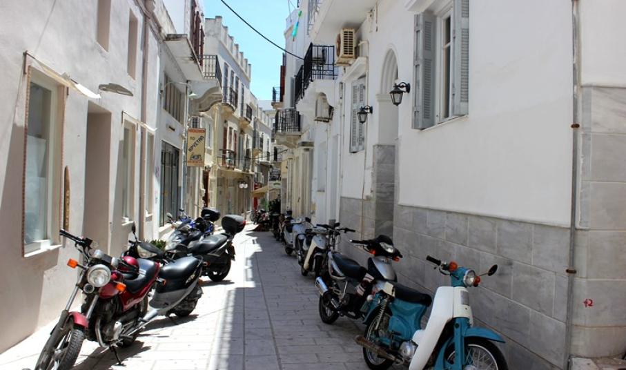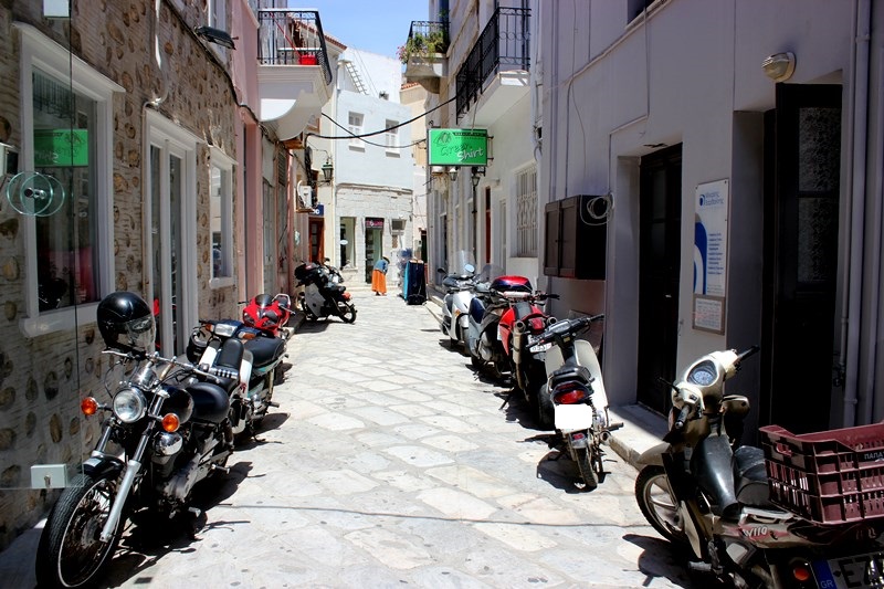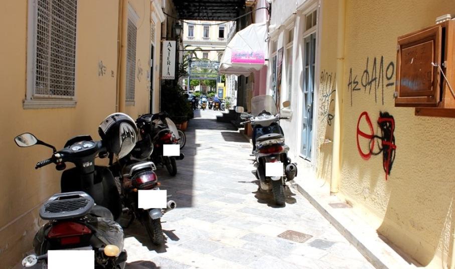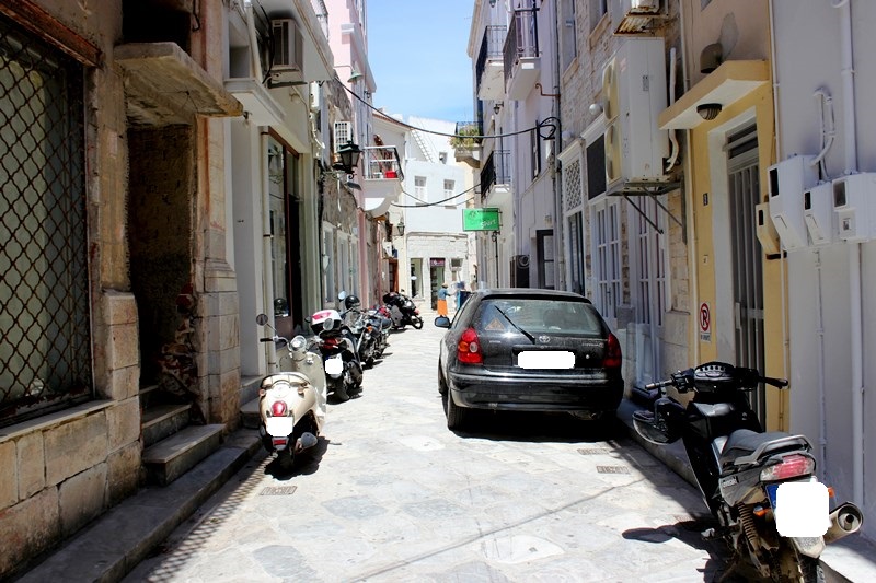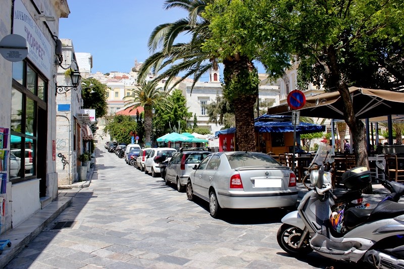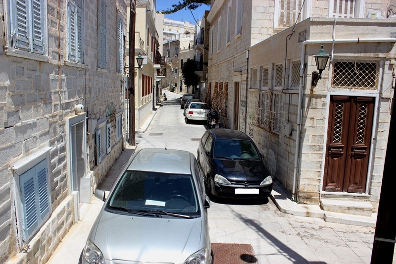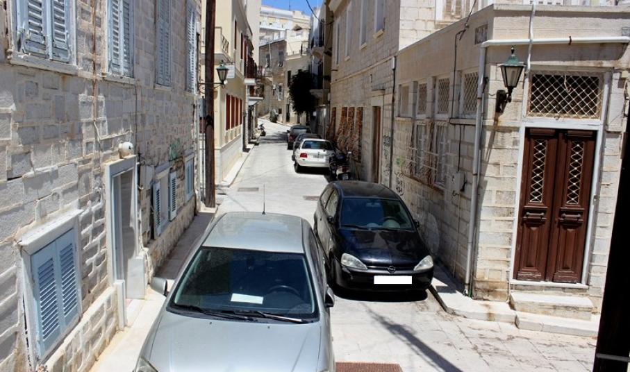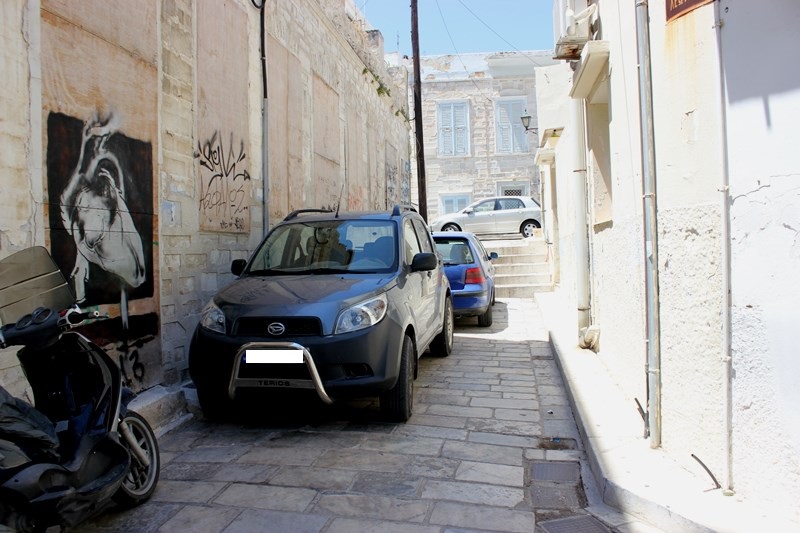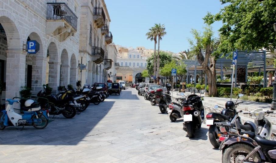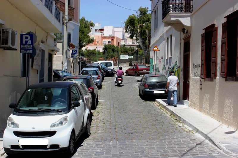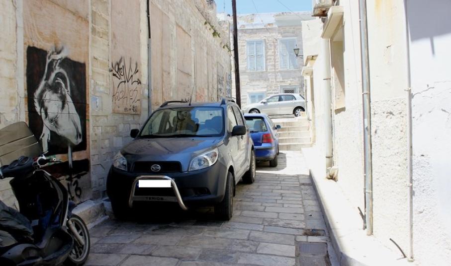 Όπως φαίνεται και από το φωτογραφικό υλικό, το οποίο συγκεντρώθηκε κατά τη διάρκεια του οδοιπορικού, εκατοντάδες δίκυκλα βρίσκονται σταθμευμένα, σε καθημερινή βάση, σε όλα ανεξαιρέτως τα πεζοδρομημένα γραφικά στενά δρομάκια της Ερμούπολης. Η κατάσταση επιδεινώνεται, με τα τετράτροχα οχήματα να καθιστούν τη διάβαση των πεζών ιδιαίτερα δύσκολη υπόθεση, καθώς καταλαμβάνουν τον μεγαλύτερο χώρο των δρομίσκων, αφήνοντας ελάχιστο περιθώριο.