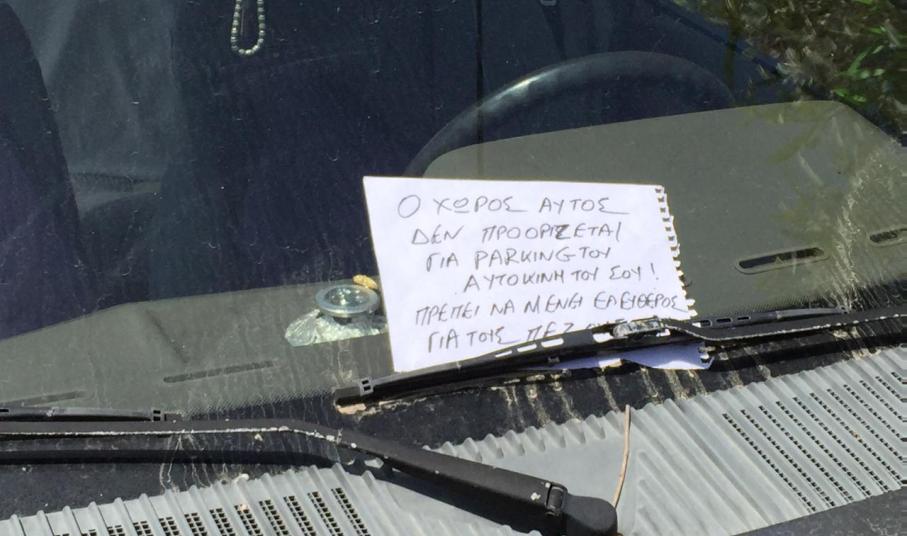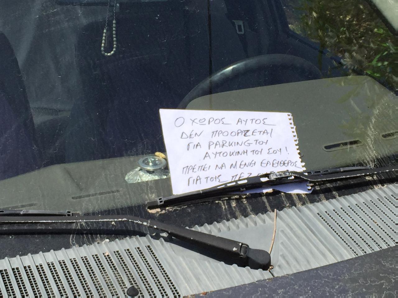 Χαρακτηριστικό παράδειγμα, το συγκεκριμένο όχημα, για το οποίο βρέθηκε η ευκαιρία, έπειτα από την απομάκρυνση των ξερόχορτων, να χρησιμοποιήσει το χώρο για πάρκινγκ, λαμβάνοντας, ωστόσο, την κατάλληλη απάντηση από κάτοικο της περιοχής, με τη μορφή σημειώματος, στο οποίο διευκρινίζεται, πως ο χώρος δεν καθαρίστηκε για την… εξυπηρέτηση του οδηγού, αλλά των πεζών.