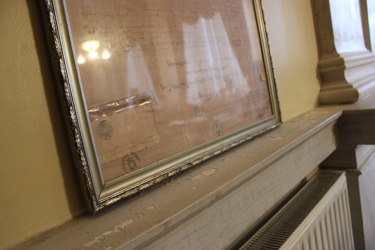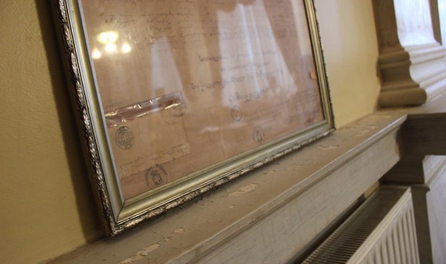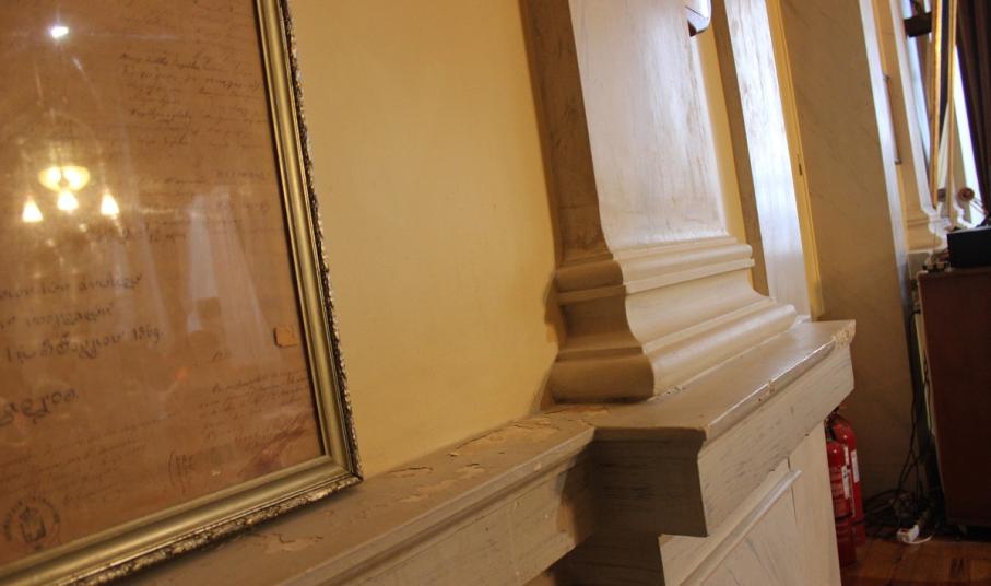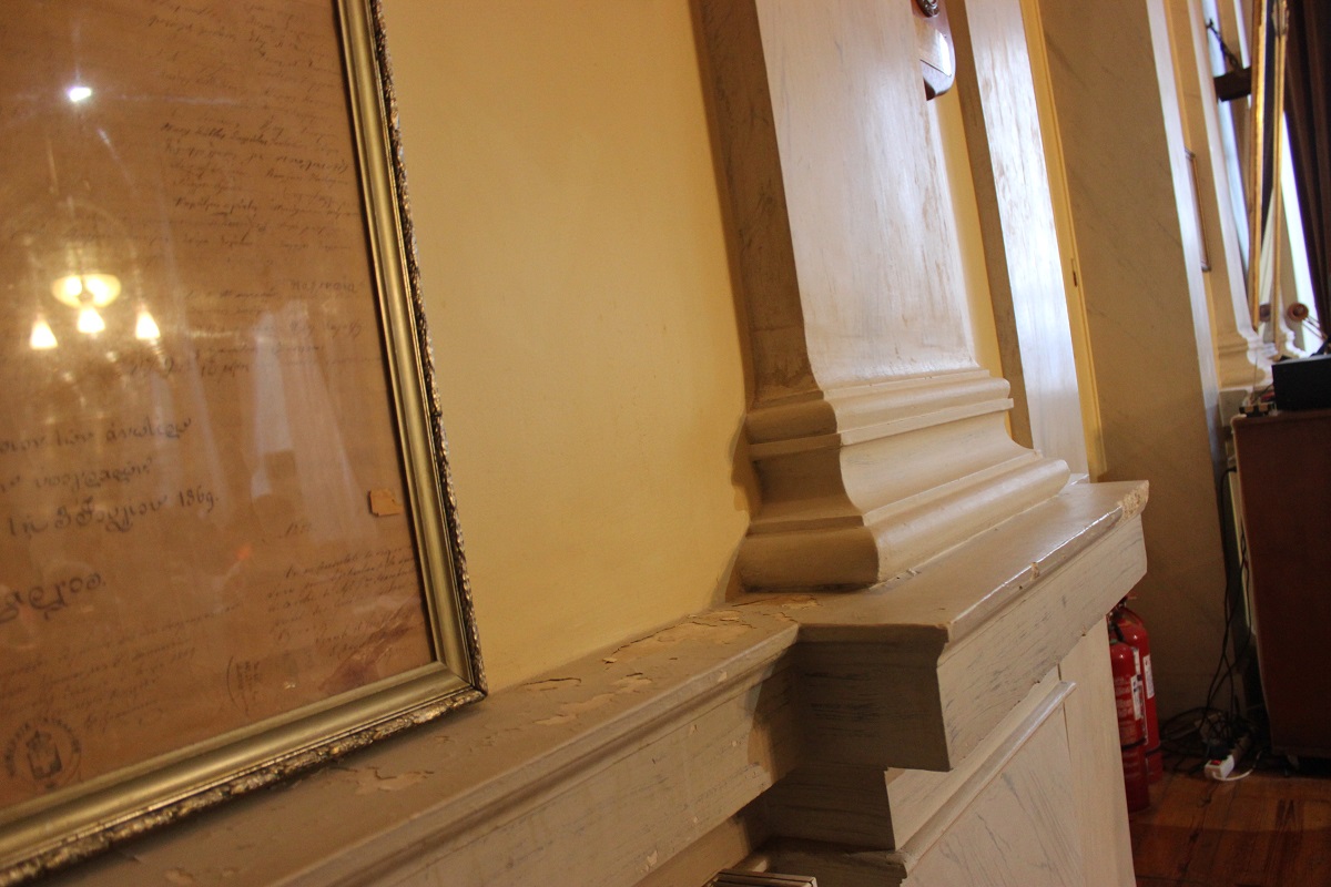 «Γερασμένος» δείχνει ο εσωτερικός χώρος του Δημαρχιακού Μεγάρου της Ερμούπολης, ακόμη και μέσα στην ευρέως χρησιμοποιούμενη αίθουσα, όπου συνεδριάζει το Δημοτικό Συμβούλιο.