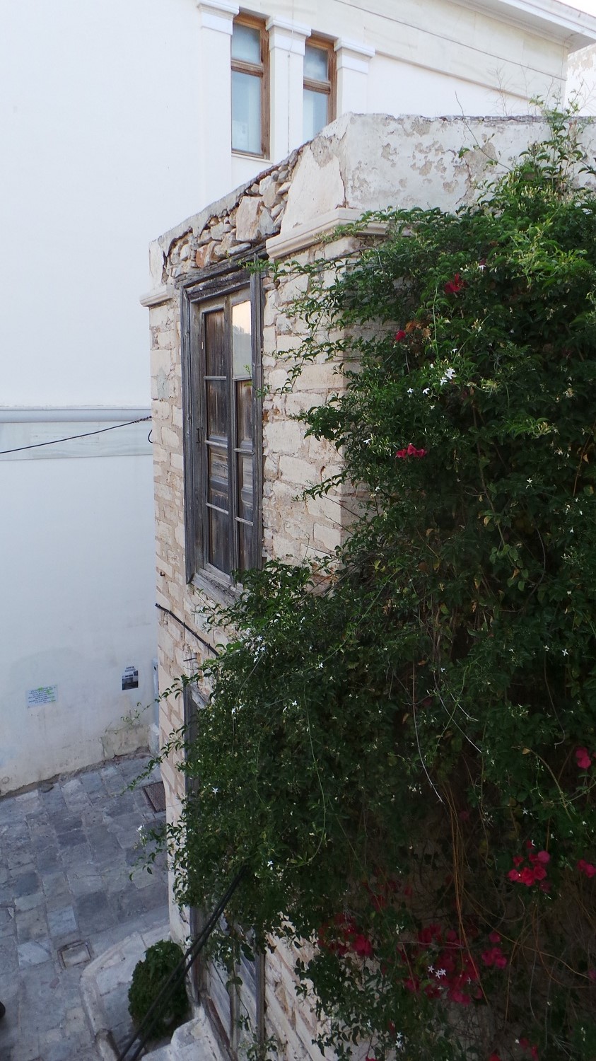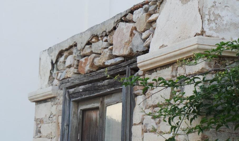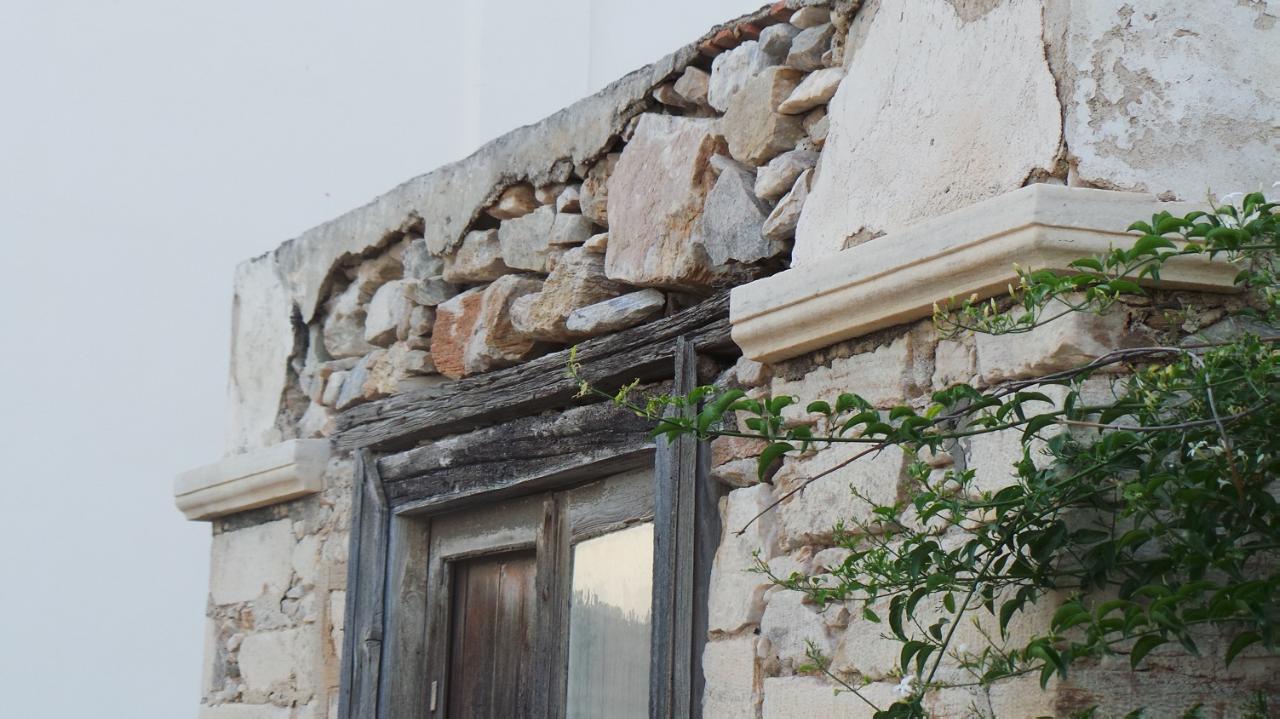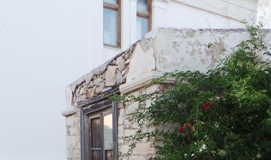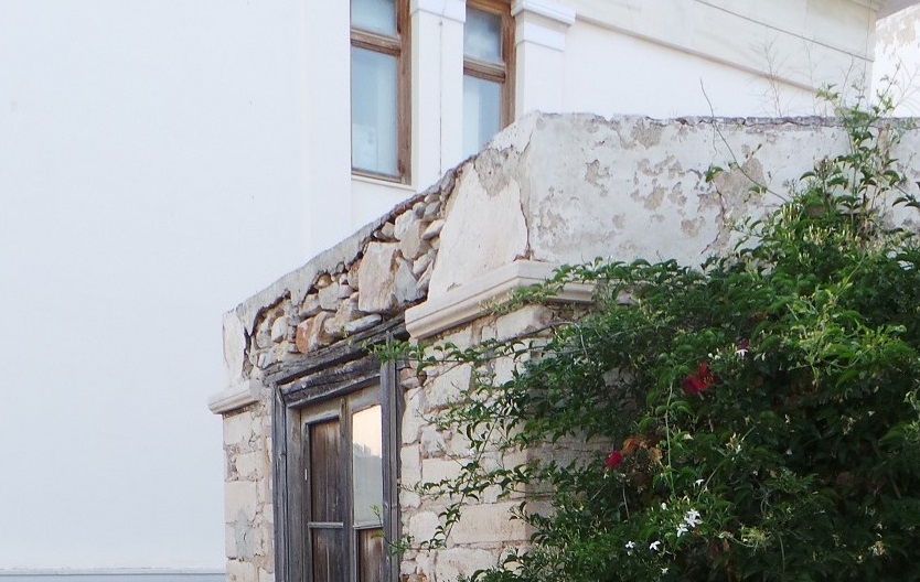 Εμφανή είναι τα σημάδια φθοράς από την πάροδο του χρόνου σε ένα ακόμη κτίριο στο κέντρο της Ερμούπολης πλησίον του καταστήματος ΟΤΕ, από το οποίο διέρχεται καθημερινά μεγάλος αριθμός πεζών, οχημάτων αλλά και δικύκλων.