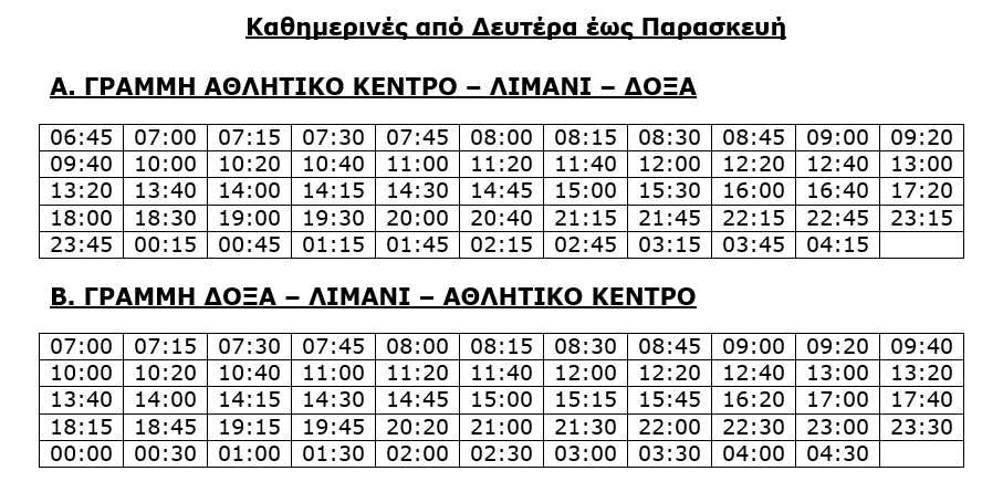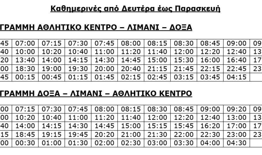 Για τις δύο κεντρικές γραμμές, δηλαδή Αθλητικό Κέντρο – Λιμάνι – Δόξα και Δόξα – Λιμάνι – Αθλητικό Κέντρο, δεν προβλέφθηκε κάποια αλλαγή στο ήδη ισχύον θερινό πρόγραμμα.