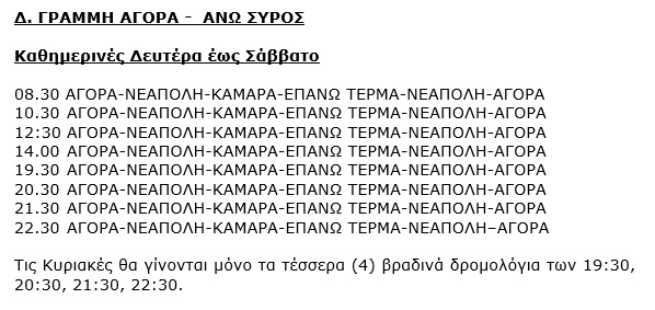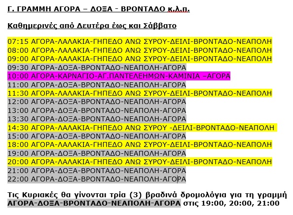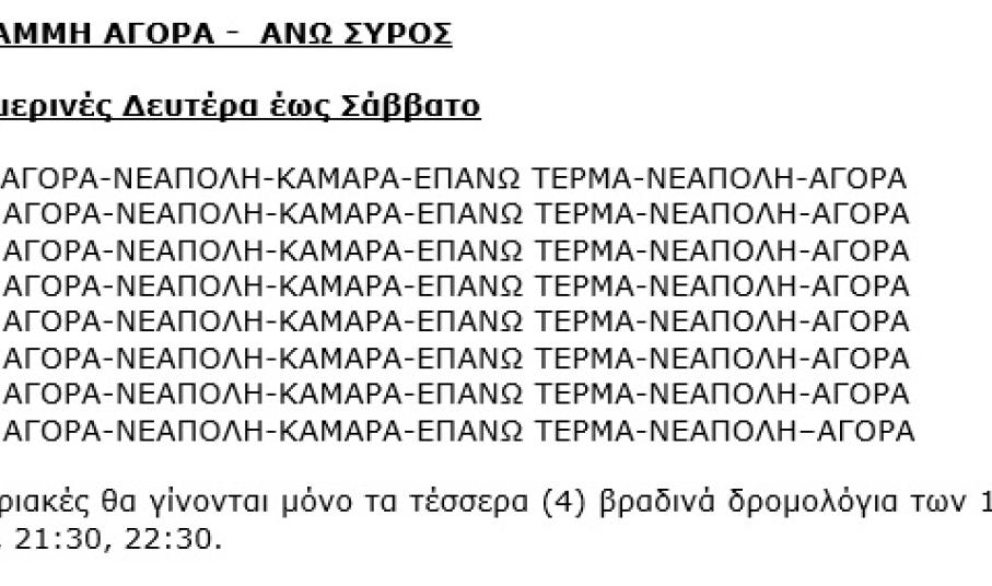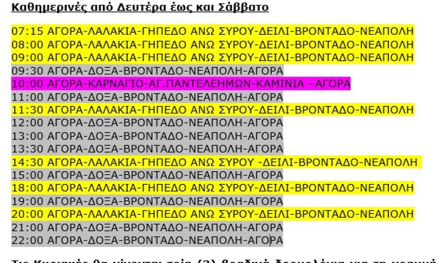 Σύμφωνα με το νέο πρόγραμμα, ο εμπλουτισμός των δρομολογίων αφορά κυρίως τις γραμμές Αγορά – Δόξα – Βροντάδο και Αγορά – Άνω Σύρος, για τις οποίες εισήχθησαν νέα δρομολόγια κατά τη διάρκεια της ημέρας και ιδιαίτερα τις μεσημβρινές ώρες, προκειμένου στους κατοίκους των περιοχών, απ’ όπου περνούν οι συγκεκριμένες γραμμές, να δοθεί επιπλέον κίνητρο για την επιλογή της αστικής συγκοινωνίας, έναντι του προσωπικού τους οχήματος, ενώ επίσης, προστέθηκαν επιπλέον βραδινά δρομολόγια.