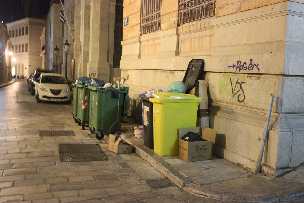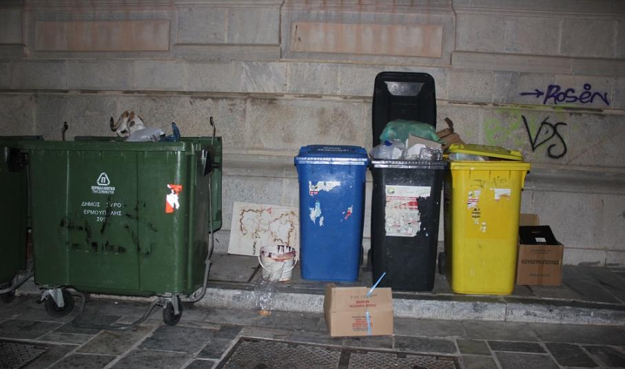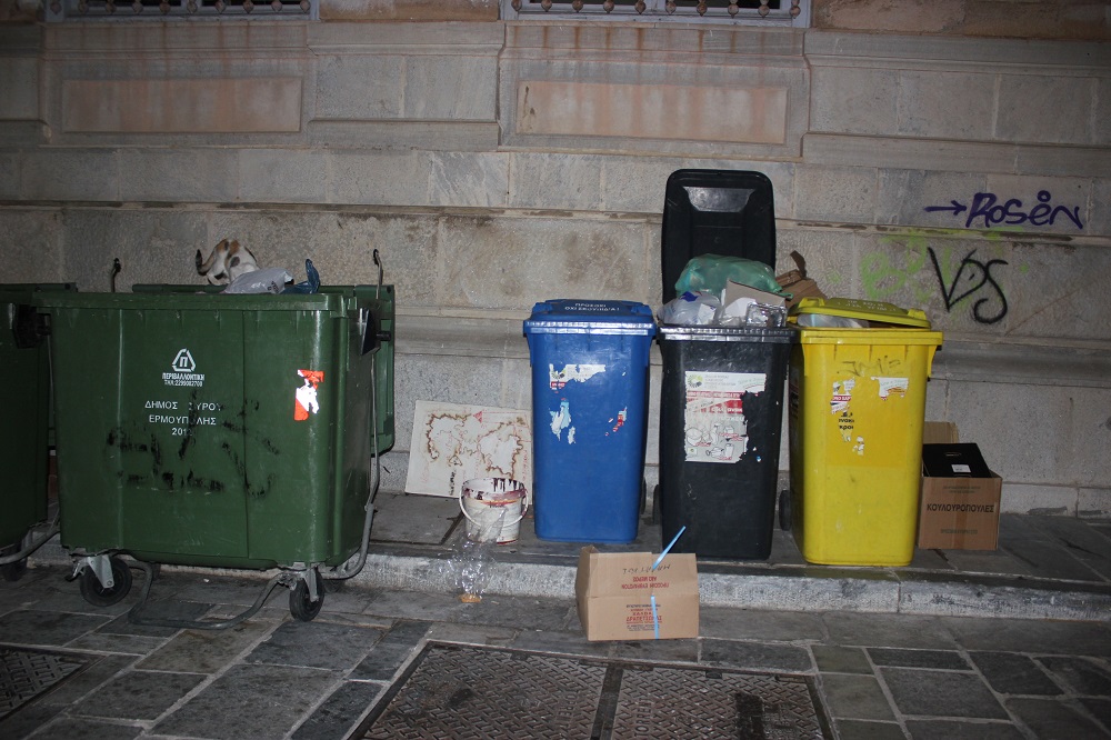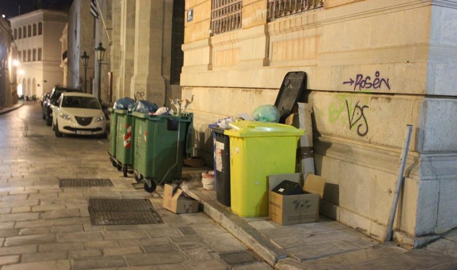 Η έντονη δυσοσμία εντός του ιστορικού κέντρου της Ερμούπολης, στην οδό Σουρή και συγκεκριμένα πλησίον του κτιρίου του Λυκείου Ελληνίδων Σύρου “έκλεψε” την παράσταση το βράδυ του Σαββάτου με απορρίμματα να βρίσκονται εκτός κάδων, διακοσμώντας τουλάχιστον... το κατά τα άλλα όμορφο πεζοδρομημένο κομμάτι της πόλης.