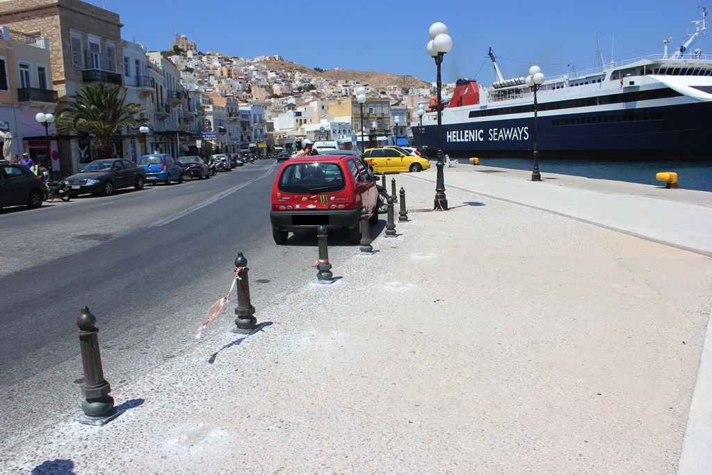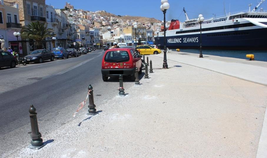 Στη μετακίνηση των ειδικών προστατευτικών πολύ πιο κοντά στο οδόστρωμα, προχώρησε το Δημοτικό Λιμενικό Ταμείο Σύρου, καθώς πολλοί ήταν οι οδηγοί, που «ανέβαζαν» τα οχήματα στο διαθέσιμο χώρο του πεζοδρομίου, προκειμένου να σταθμεύσουν για αρκετές ώρες, ιδιαίτερα κατά τη διάρκεια της νύχτας, όταν εφαρμόζεται και το μέτρο πεζοδρόμησης του ιστορικού κέντρου της Ερμούπολης.