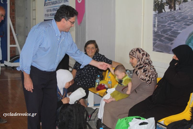Το Κλειστό Γυμναστήριο επισκέφτηκε και ο δήμαρχος Νάξου και Μικρών Κυκλάδων, κ. Μανόλης Μαργαρίτης, συνοδεία του αντιδημάρχου κ. Τοτόμη Πρωτονοτάριου, οι οποίοι συνομίλησαν με εκπροσώπους των Αρχών και εθελοντές, οι οποίοι παρακολουθούν από κοντά το ζήτημα, αλλά και με τους ίδιους τους πρόσφυγες, εκφράζοντας την συμπαράστασή τους στις δύσκολες αυτές στιγμές.
