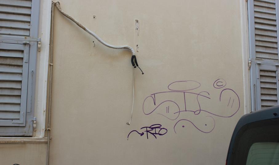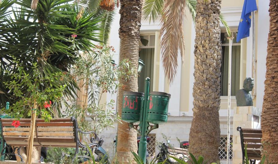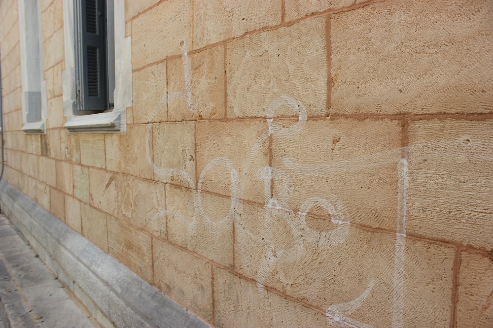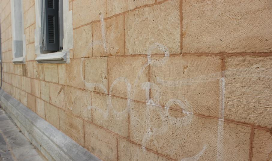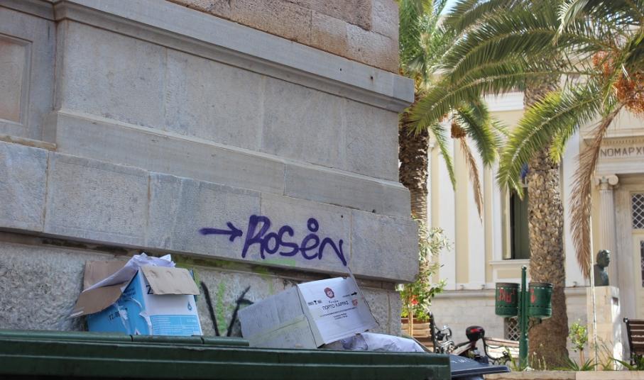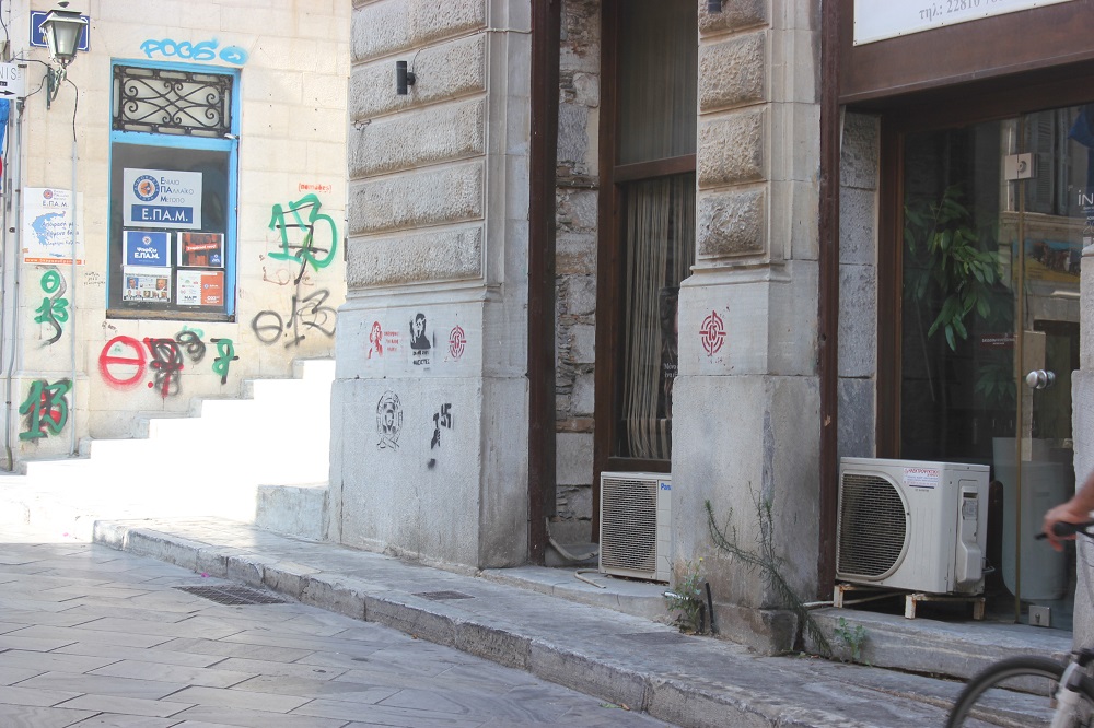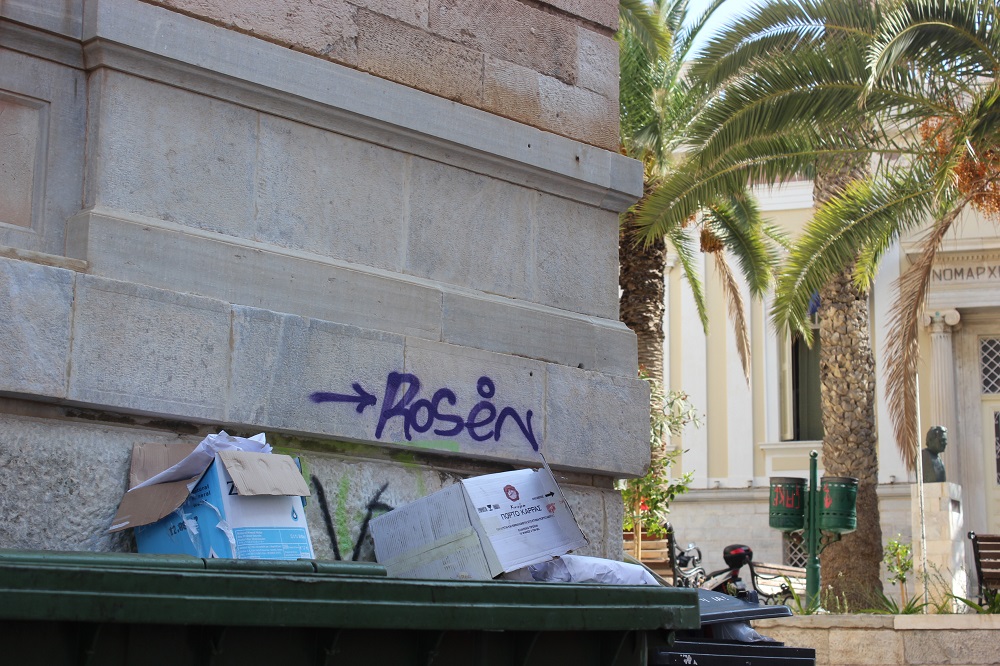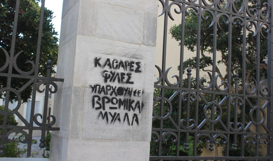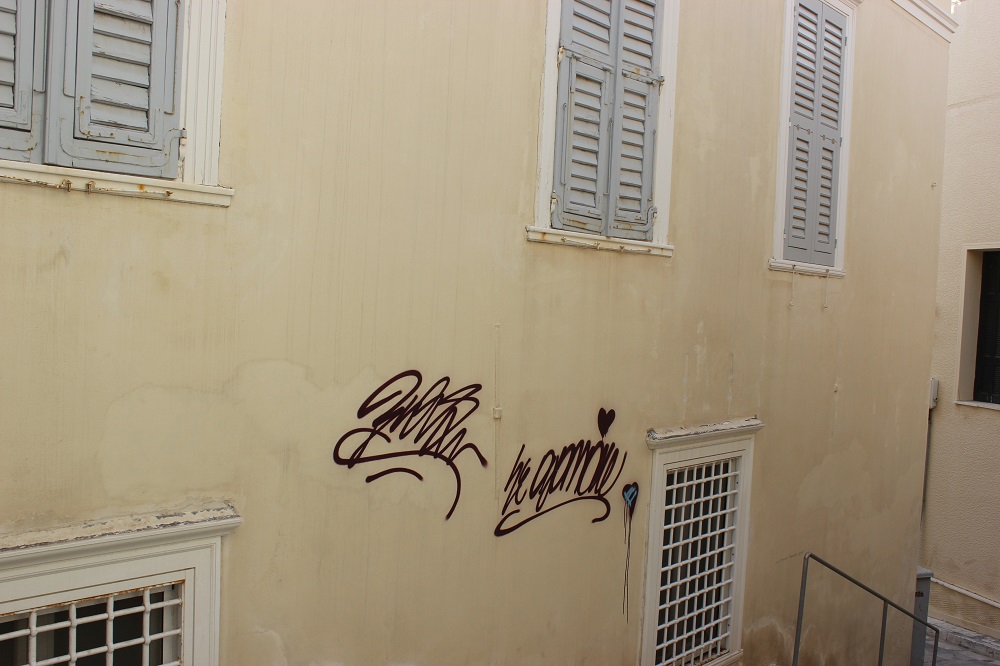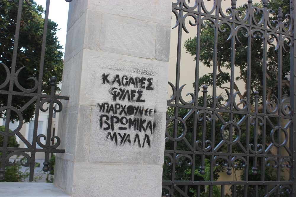 Πέτρινες αλλά και μαρμάρινες επιφάνειες κτιρίων, προσόψεις καταστημάτων, καθώς επίσης οι επιφάνειες δημόσιων κτιρίων όπως της Περιφέρειας Νοτίου Αιγαίου αλλά ακόμη και οι κάδοι απορριμμάτων σε μικρές πλατείες (πχ. Πλατεία Τσιροπινά), “κοσμούνται” από τη μανία συμπολιτών μας να “στολίζουν” το ιστορικό κέντρο τακτικά με συνθήματα ή γκράφιτι, η πλειοψηφία των οποίων συνήθως, δεν εκφράζει καμία ουσία και δεν έχει κανένα ουσιαστικό περιεχόμενο.