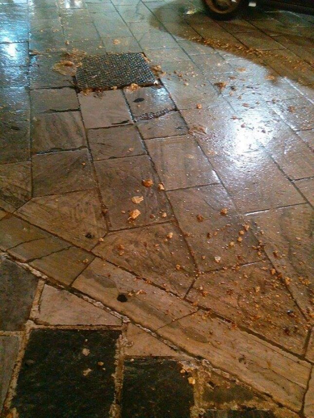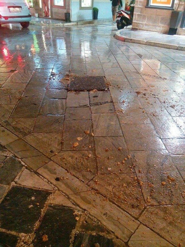 Το πραγματικά “ευτράπελο” γεγονός, ωστόσο, σημειώθηκε την ίδια ώρα στην οδό Ελευθερίου Βενιζέλου (πρώην οδ. Ερμού), στο ιστορικό κέντρο της Ερμούπολης, όπου τα φρεάτια ανάβλυζαν επί ώρα υγρά, αλλά και στερεά βοθρολύματα, τα οποία πλημμύρισαν όλο το μήκος του δρόμου, αναδύοντας μία ανυπόφορη μυρωδιά, που κράτησε για αρκετές ώρες αργότερα “πνίγοντας” το ιστορικό κέντρο.