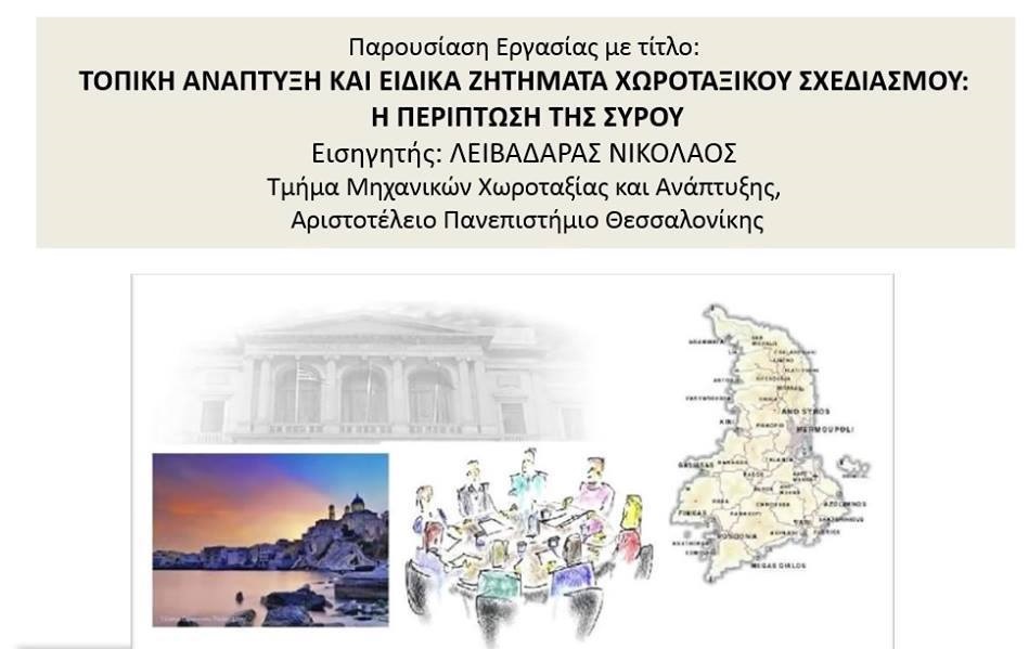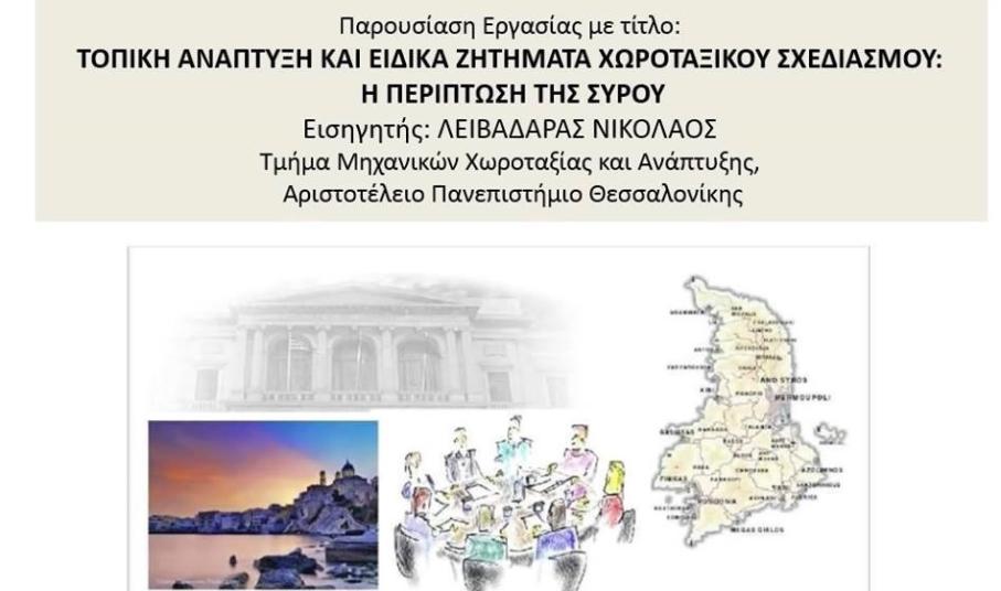 Εργασία, σχετικά με την τοπική ανάπτυξη, αλλά και τα θέματα χωροταξίας της Σύρου, παρουσίασε κατά τη διάρκεια των εργασιών του 4ου Πανελληνίου Συνεδρίου Πολεοδομίας, Χωροταξίας και Ανάπτυξης, ο Μηχανικός Χωροταξίας και Ανάπτυξης, κ. Νίκος Λειβαδάρας.