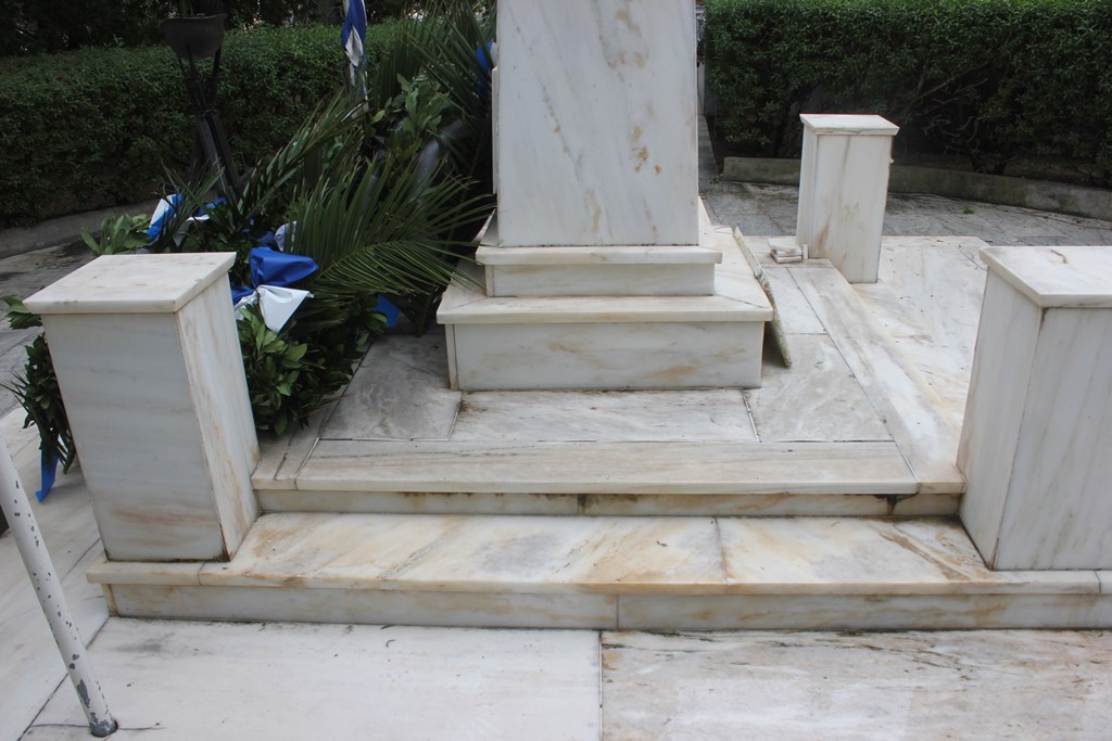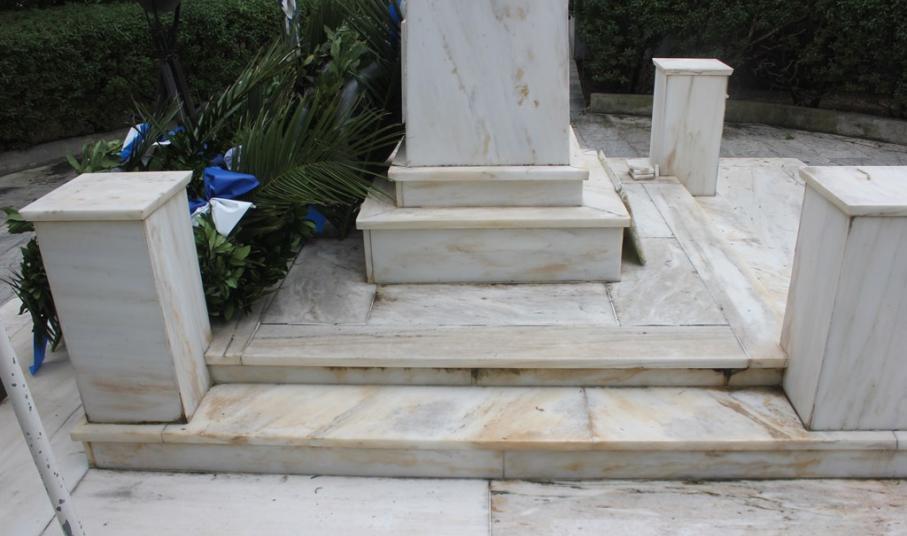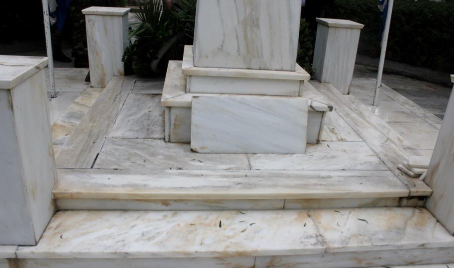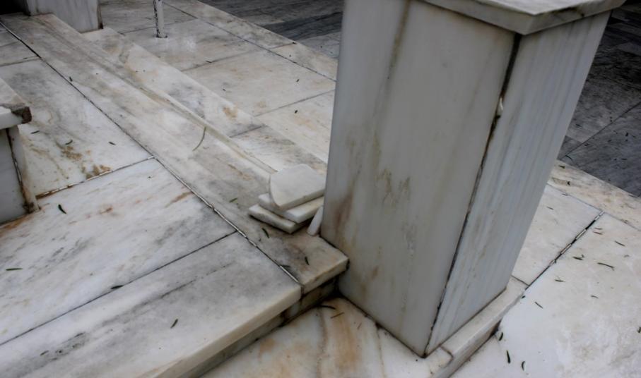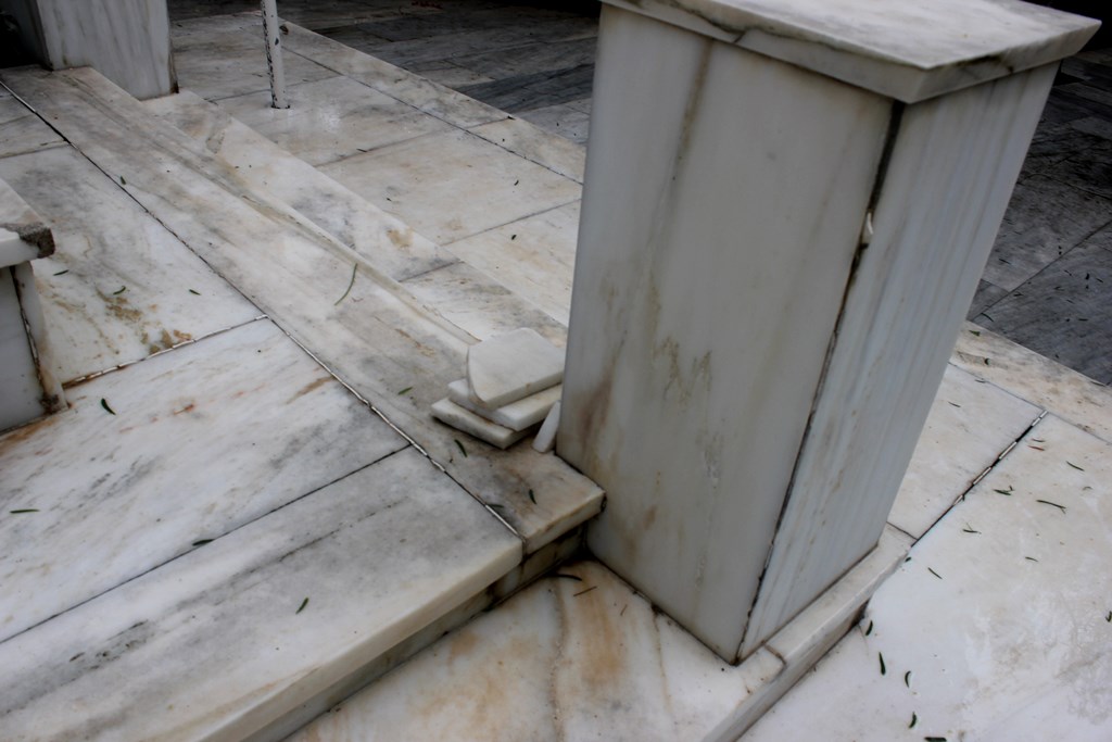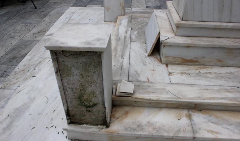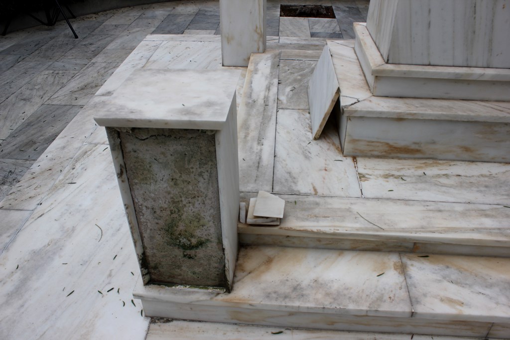 Αρκετές μαρμάρινες πλάκες έχουν σπάσει ή αποκολληθεί, αλλά δεν έχουν απομακρυνθεί από το μνημείο, με αποτέλεσμα να το «κοσμούν» τοποθετημένες τακτοποιημένα επάνω σε αυτό.