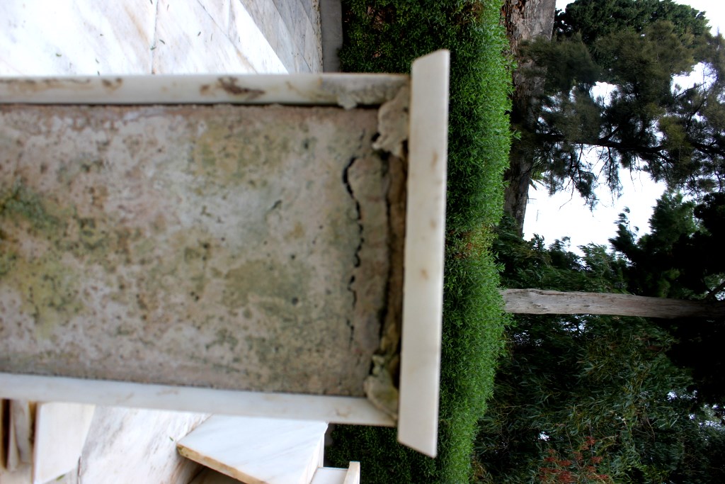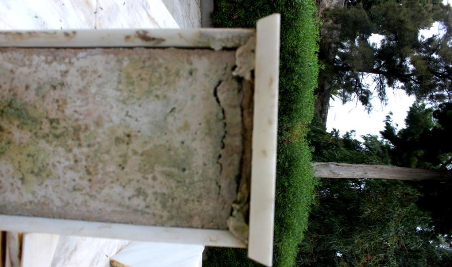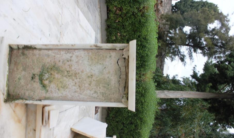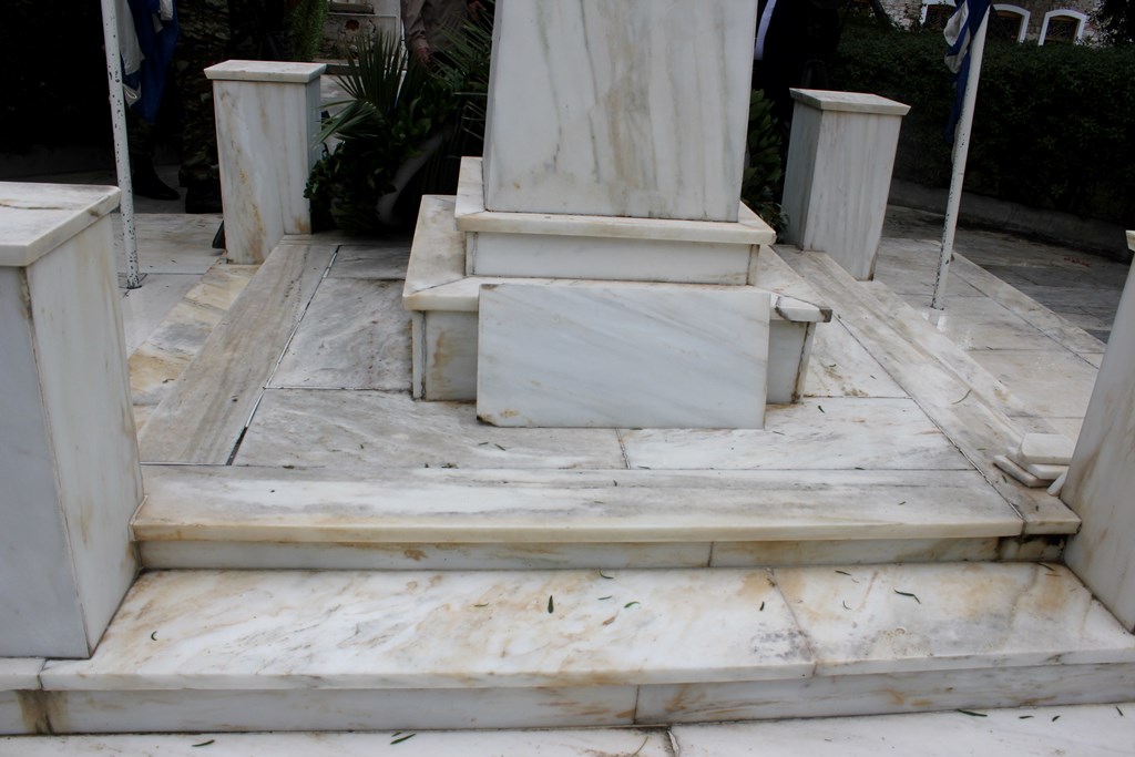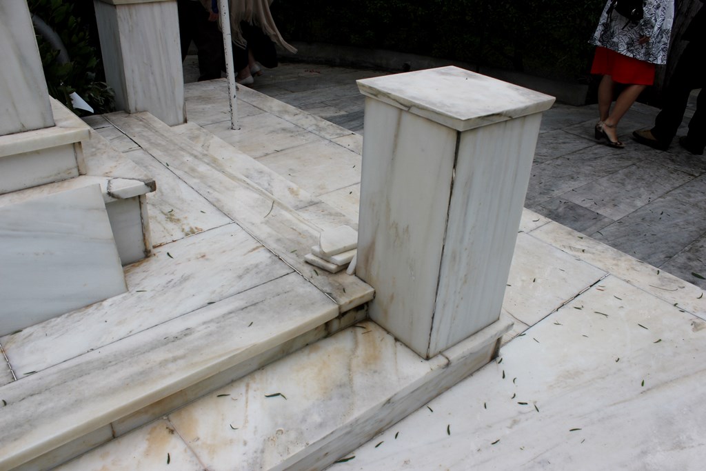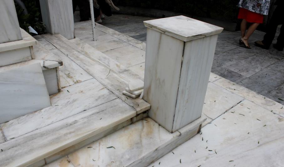 Αρκετές μαρμάρινες πλάκες έχουν σπάσει ή αποκολληθεί, αλλά δεν έχουν απομακρυνθεί από το μνημείο, με αποτέλεσμα να το «κοσμούν» τοποθετημένες τακτοποιημένα επάνω σε αυτό.
