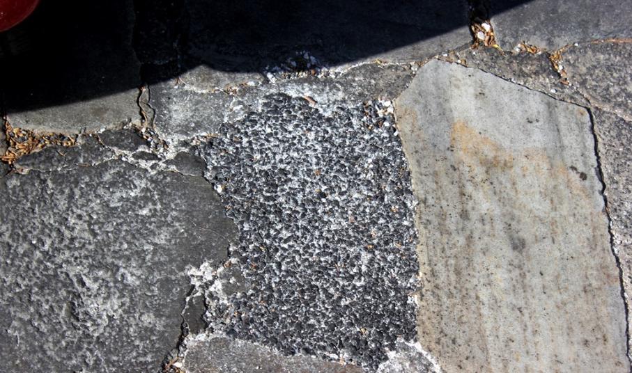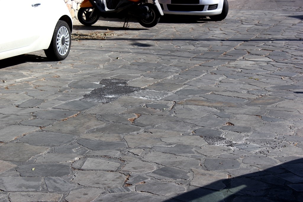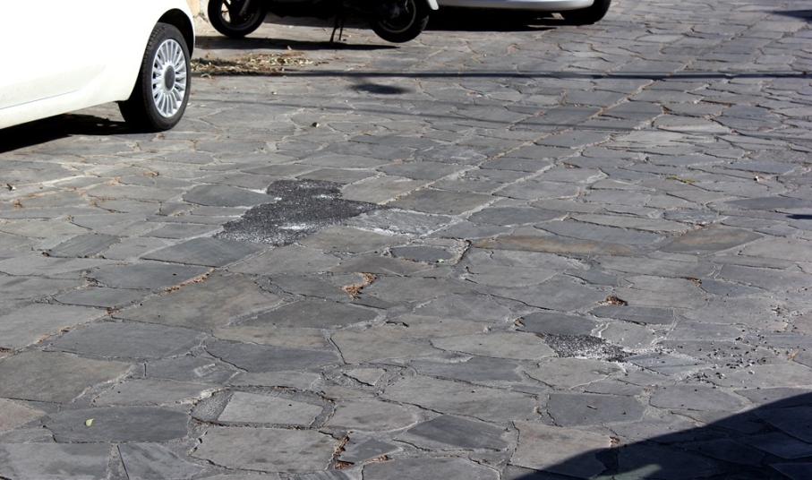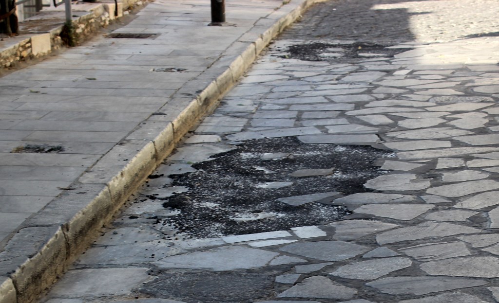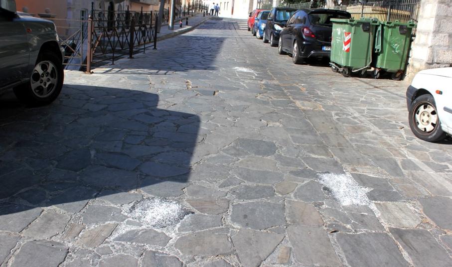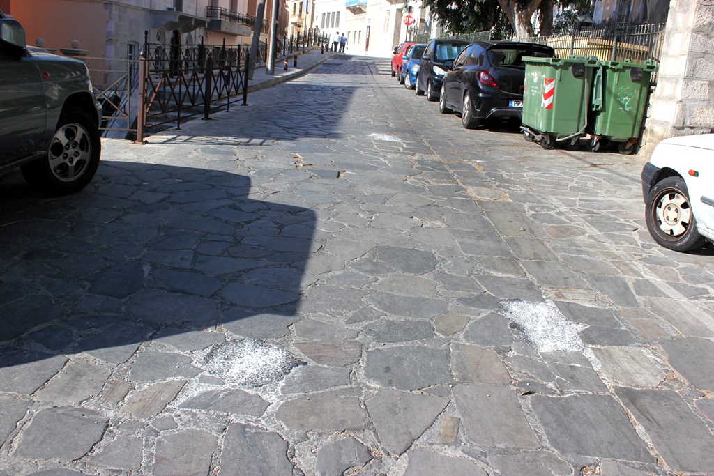 Παρά το γεγονός, ότι πρόκειται για μία εκ των πλακόστρωτων οδών, οι οποίες χρήζουν ειδικής μέριμνας, προκειμένου να διατηρήσουν τον παραδοσιακό χαρακτήρα τους, όπως έχει επανειλημμένα τονιστεί από την πλευρά της Δημοτικής Κοινότητας Ερμούπολης, οι λακκούβες, οι οποίες είχαν δημιουργηθεί από την αποκόλληση των πλακών, γέμισαν με… πίσσα.