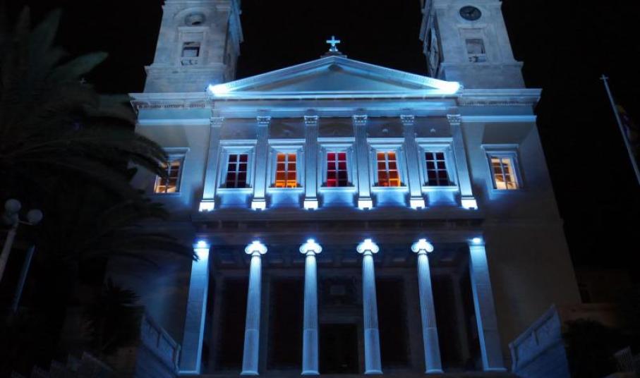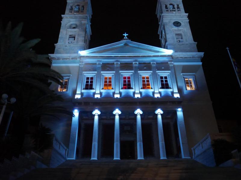 Στο πλαίσιο της παγκόσμιας εκστρατείας για τον εορτασμό της Ημέρας του ΟΗΕ, ο Καθεδρικός Ιερός Ναός του Αγίου Νικολάου Ερμουπόλεως, φωταγωγήθηκε το βράδυ του περασμένου Σαββάτου με το μπλε χρώμα του Οργανισμού μαζί με άλλα 150 μνημεία, κτίρια, μουσεία, γέφυρες και άλλα εμβληματικά κτίρια σε περισσότερες από 45 χώρες σε όλο τον κόσμο.
