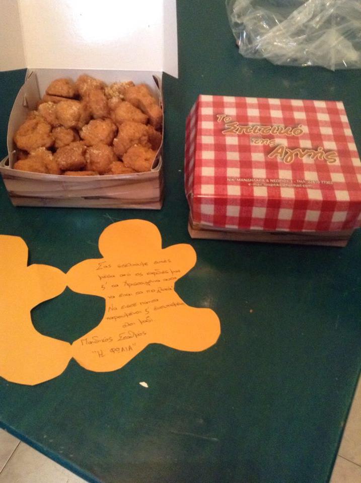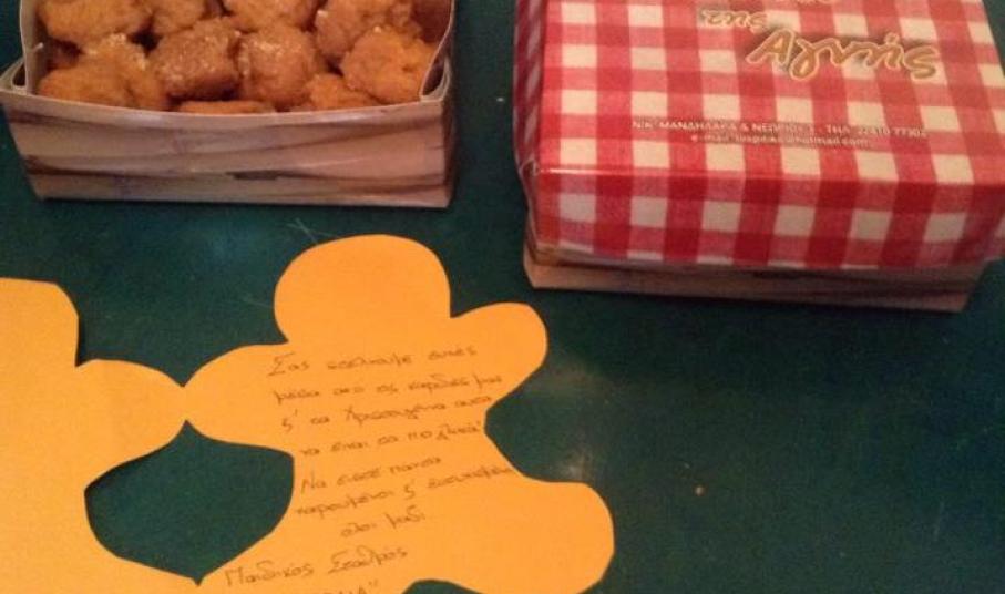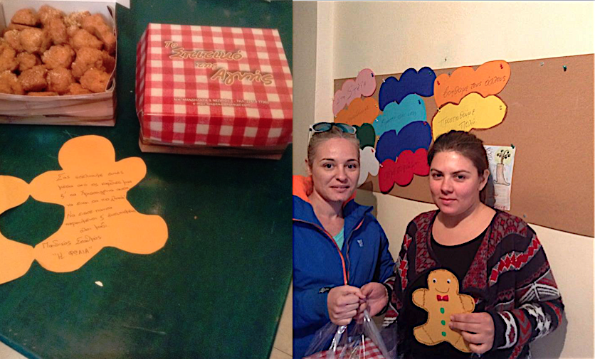 Στην πόρτα της «Στέγης Ανηλίκων Σύρου» παραδόθηκαν χθες το πρωί τα χριστουγεννιάτικα γλυκά, που έφτιαξαν με τα χεράκια τους τα προ-προνήπια του Παιδικού Σταθμού «Η Φωλιά» στο ζαχαροπλαστείο - καφέ «Το Σπιτικό της Αγνής».