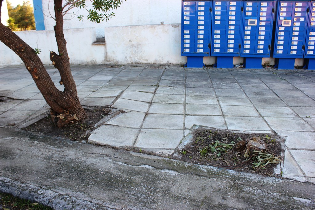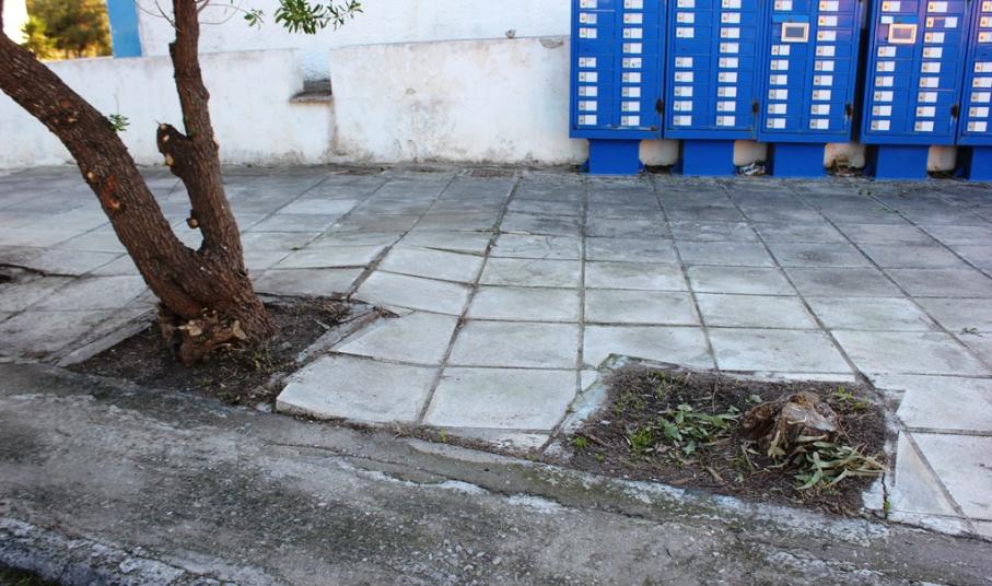 Στο μικρό σημείο που έχουν στρωθεί πλάκες, οι ρίζες των δέντρων έχουν, με την πάροδο του χρόνου, καταφέρει να τις «σηκώσουν», με αποτέλεσμα το έδαφος να παρουσιάζει ανισόπεδα τμήματα, επικίνδυνα, κυρίως για τους πεζούς πολύ μικρής ή πολύ μεγάλης ηλικίας.