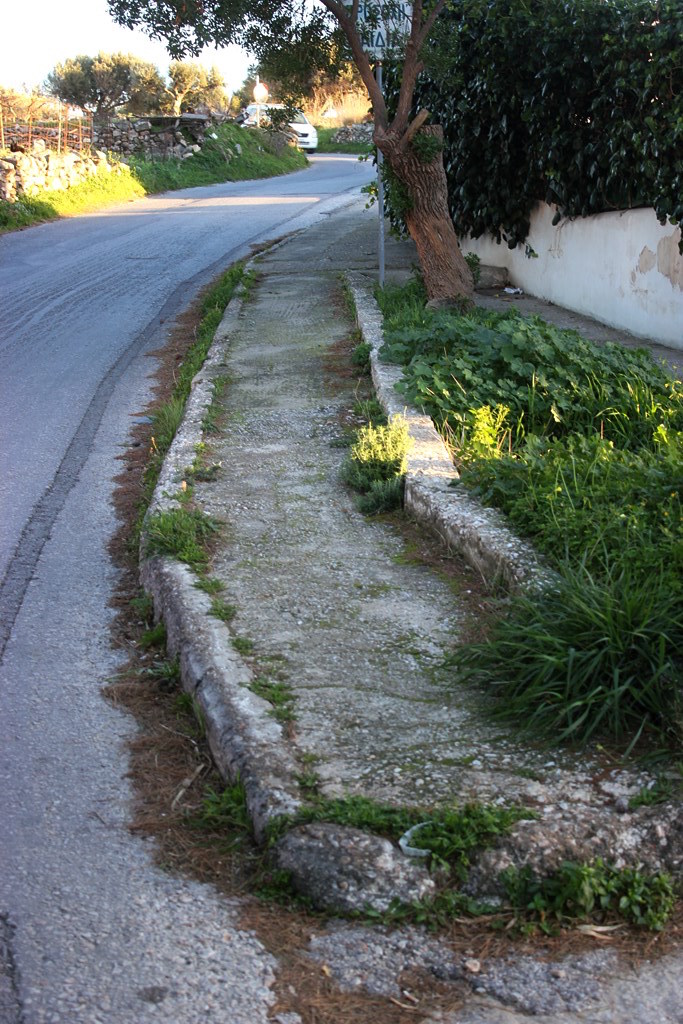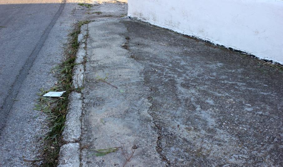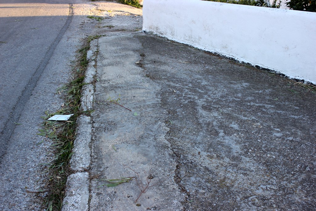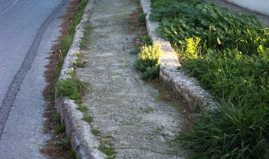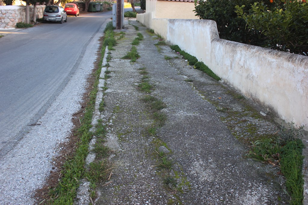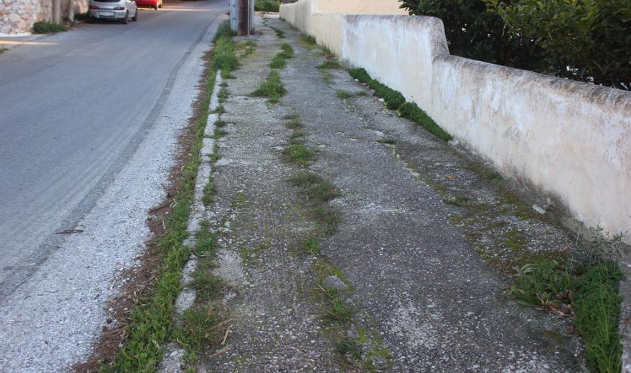 Τα περισσότερα πεζοδρόμια είναι σκυροδετημένα, χωρίς να έχουν στρωθεί πλάκες, με αποτέλεσμα το σκυρόδεμα να έχει παρουσιάσει ρωγμές και φθορές, λόγω της συνεχούς έκθεσής του στα φυσικά φαινόμενα. Μάλιστα, σε αρκετές από τις ρωγμές, έχουν βρει «καταφύγιο» αρκετά αγριόχορτα, τα οποία φυτρώνουν μέσα σε αυτές, με αποτέλεσμα να ευνοείται η περεταίρω διάσπαση του μπετόν.