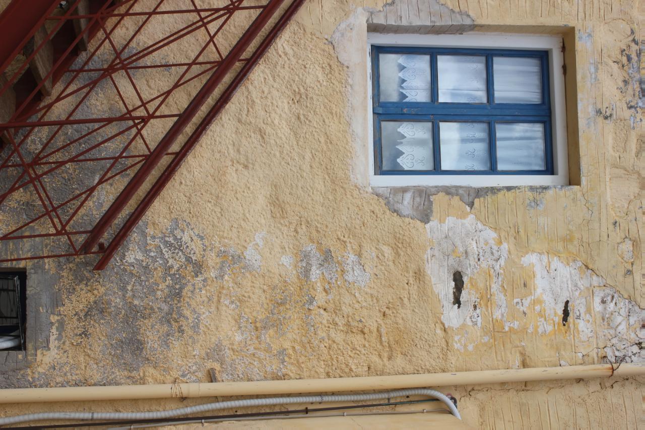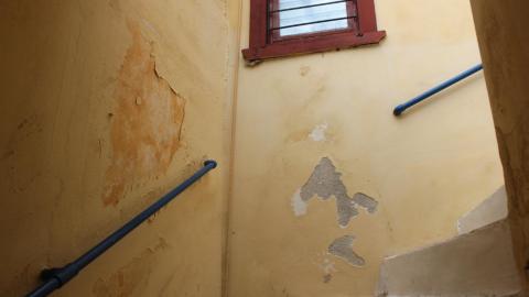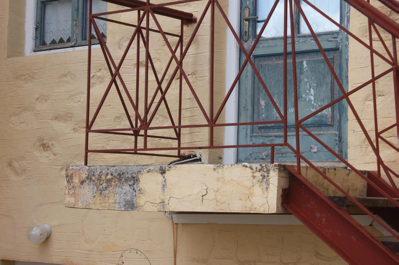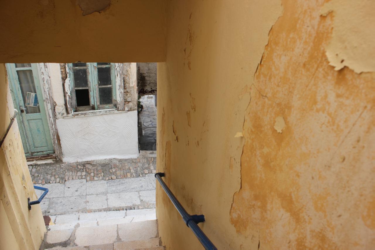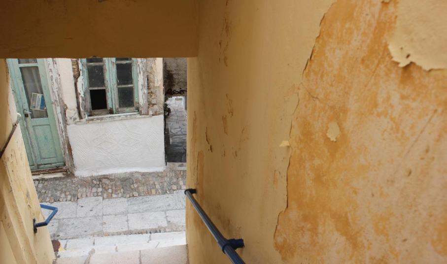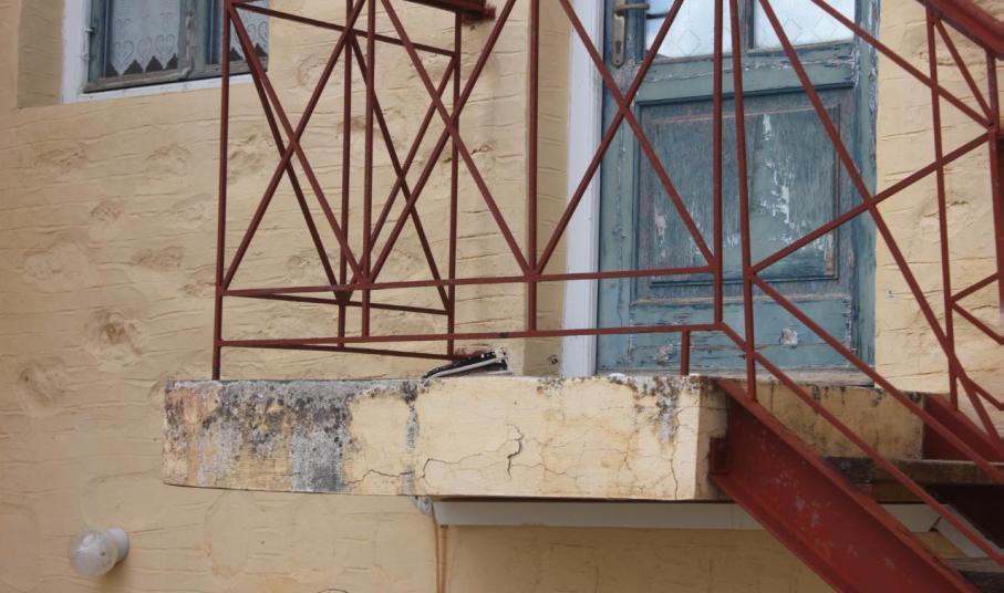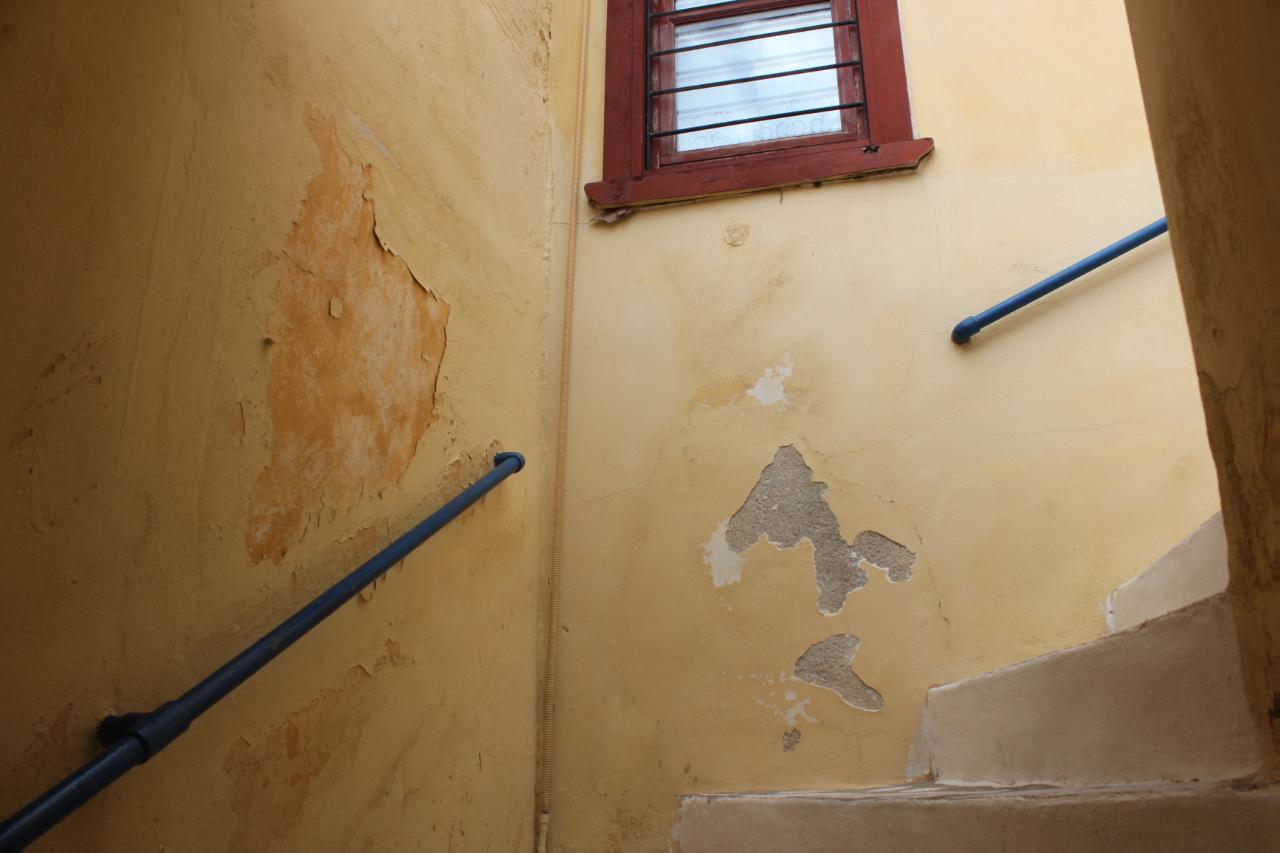 Περισσότερο από τους εξωτερικούς τοίχους, ωστόσο, τα φυσικά φαινόμενα δείχνουν να έχουν επηρεάσει το χώρο, όπου βρίσκεται η μεταλλική σκάλα, η οποία οδηγεί στο π. γραφείο Δημάρχου και της π. Γραμματείας του Δημοτικού Συμβουλίου.