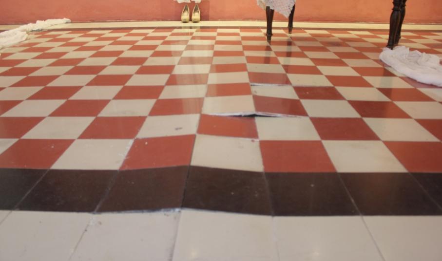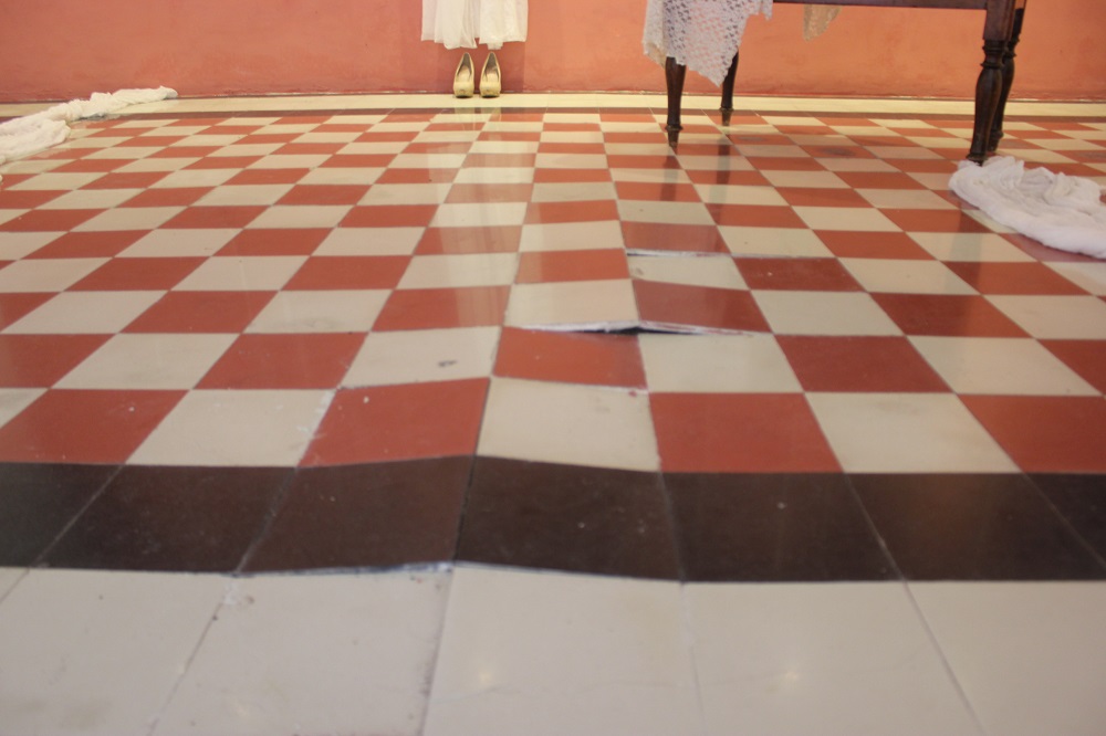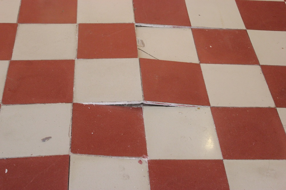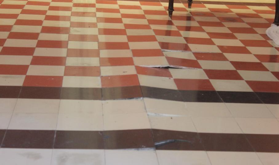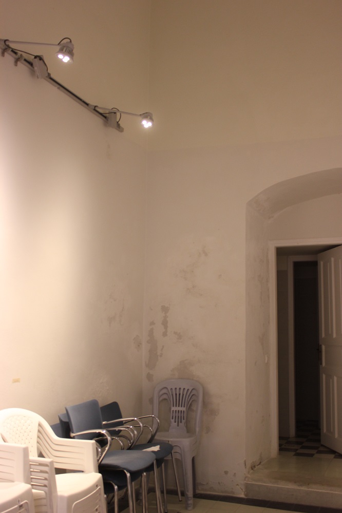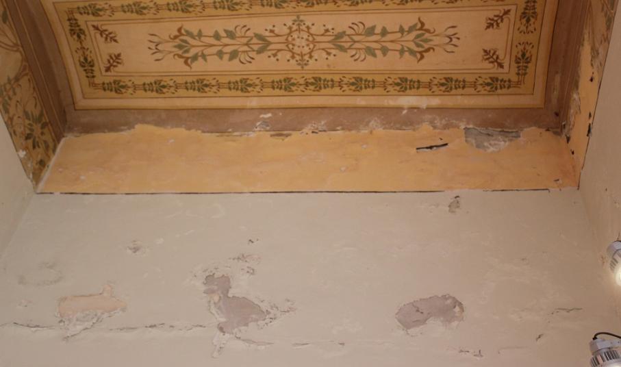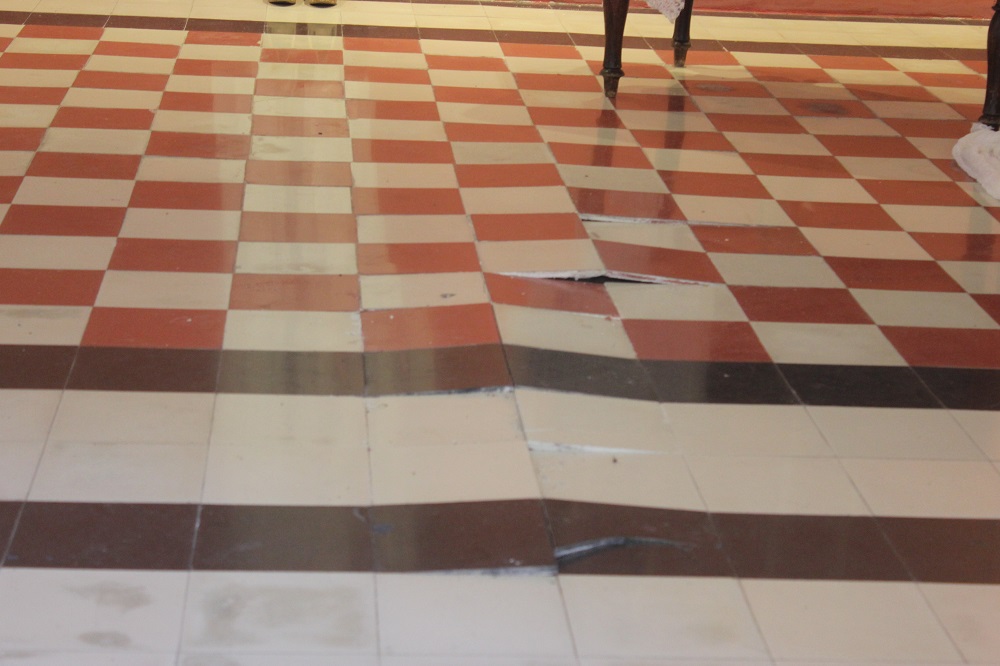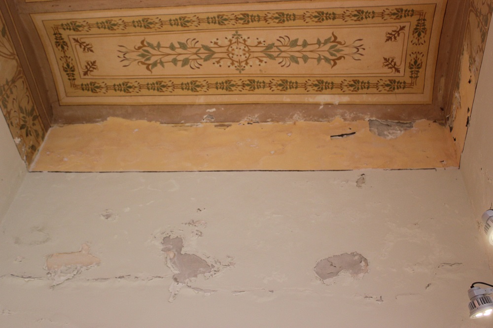 Πέραν της υγρασίας που αποτυπώνεται στις επιφάνειες των τοίχων σε όλα τα τμήματα με την αποκόλληση σοβάδων μάλιστα να είναι εμφανής, όπως άλλωστε και οι διχρωμίες που δημιουργούνται, τεράστια προβλήματα παρατηρούνται και στα πατώματα της αίθουσας. Σπασμένα πλακάκια, με κάποια εξ αυτών δε, να παραμένουν σχεδόν “στον αέρα” προκαλούν έντονα θέματα και στην ομαλή αξιοποίηση όλων των χώρων, αφού οι επισκέπτες δεν μπορούν να βαδίσουν απρόσκοπτα σε κατάλληλο πάτωμα. Αν και συνολικά το κτίριο θα πρέπει να συντηρηθεί μέσω της υλοποίησης ενός μεγάλου έργου αφού ο χρόνος έχει “γεννήσει” πολλά προβλήματα εσωτερικά και εξωτερικά όπως επίσης και η καταστροφή οροφογραφιών, ωστόσο, με δεδομένο ότι η χρήση του είναι συνεχής για την προώθηση πολιτιστικών εκδηλώσεων, κρίνεται αναγκαίο να προγραμματισθούν έστω και περιορισμένου χαρακτήρα παρεμβάσεις με σκοπό τη στοιχειώδη ενίσχυση του εν λόγω χώρου.