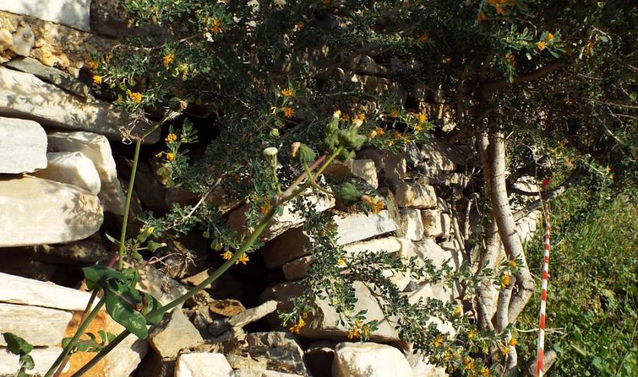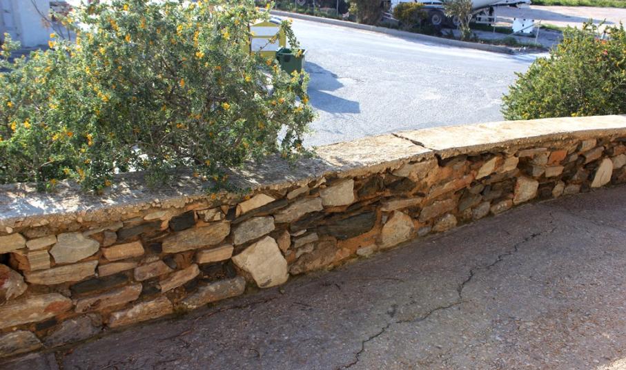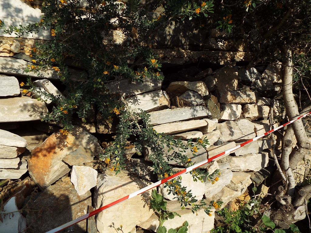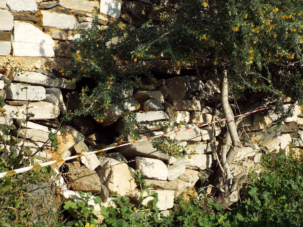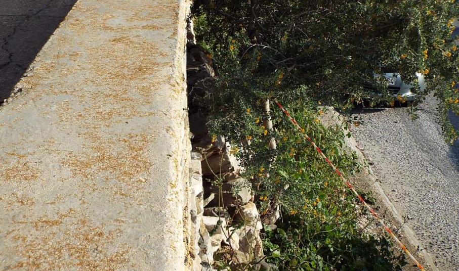 Με την πάροδο του χρόνου, οι πέτρες του τοιχίου σε συγκεκριμένο σημείο έχουν μετακινηθεί αρκετά προς τα έξω, με αποτέλεσμα αρκετές από αυτές να έχουν καταρρεύσει, ενώ οι υπόλοιπες, λόγω της μετακίνησης, να μην είναι ικανές να συγκρατήσουν το χώμα, στην εσωτερική πλευρά του τοίχου.