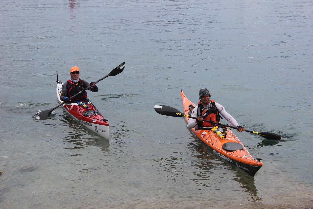 Ο Άγγελος Χριστοφίδης και ο Κώστας Μανατάκης, οι οποίοι έχουν διανύσει μέχρι σήμερα το ήμισυ της απόστασης, κατέπλευσαν στην περιοχή “Νησάκι”, συνοδευόμενοι από σκάφος του Λιμενικού Σώματος, αλλά και τον αθλητή Αντώνη Δουράτσο, μέλος του Ναυτικού Ομίλου Σύρου, με σημαντικές διακρίσεις στο άθλημα κανόε – καγιάκ. Οι δύο αθλητές υποστηρίζονται από τους Ορφέα Καλαφάτη και Χρήστο Φλεβοτόμο, οι οποίοι μοιράζονται μαζί τους τη βαθιά αγάπη τους για τη θάλασσα και τα ναυτικά ταξίδια, αλλά και την επιθυμία τους για συνεχή προσφορά στο κοινωνικό σύνολο.