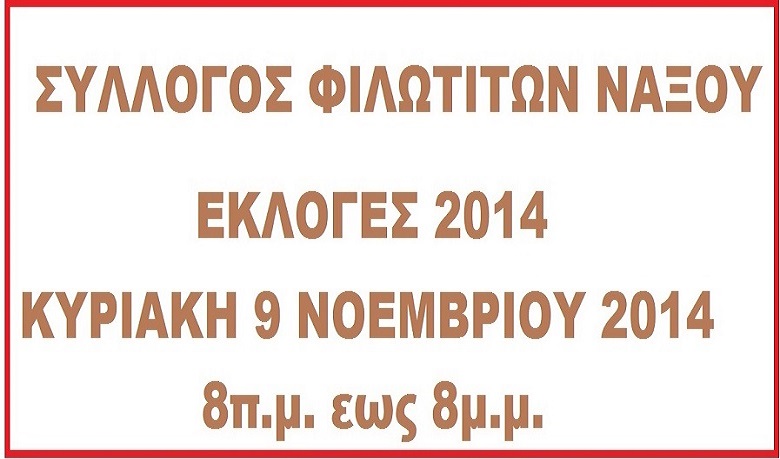 «Αγαπητά μέλη του Συλλόγου Φιλωτιτών Νάξου. Σας ενημερώνουμε ότι την Κυριακή 9 Νοεμβρίου 2014 από τις 8 το πρωί έως τις 8 το βράδυ θα διεξαχθούν στα γραφεία του Συλλόγου, στου Ψυρρή, οι  εκλογές για την ανάδειξη του νέου Διοικητικού Συμβουλίου. Δικαίωμα ψήφου έχουν όσοι έχουν συμπληρώσει το 16o έτος της ηλικίας τους.