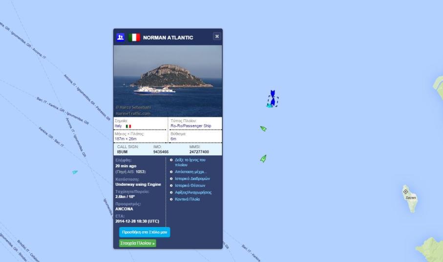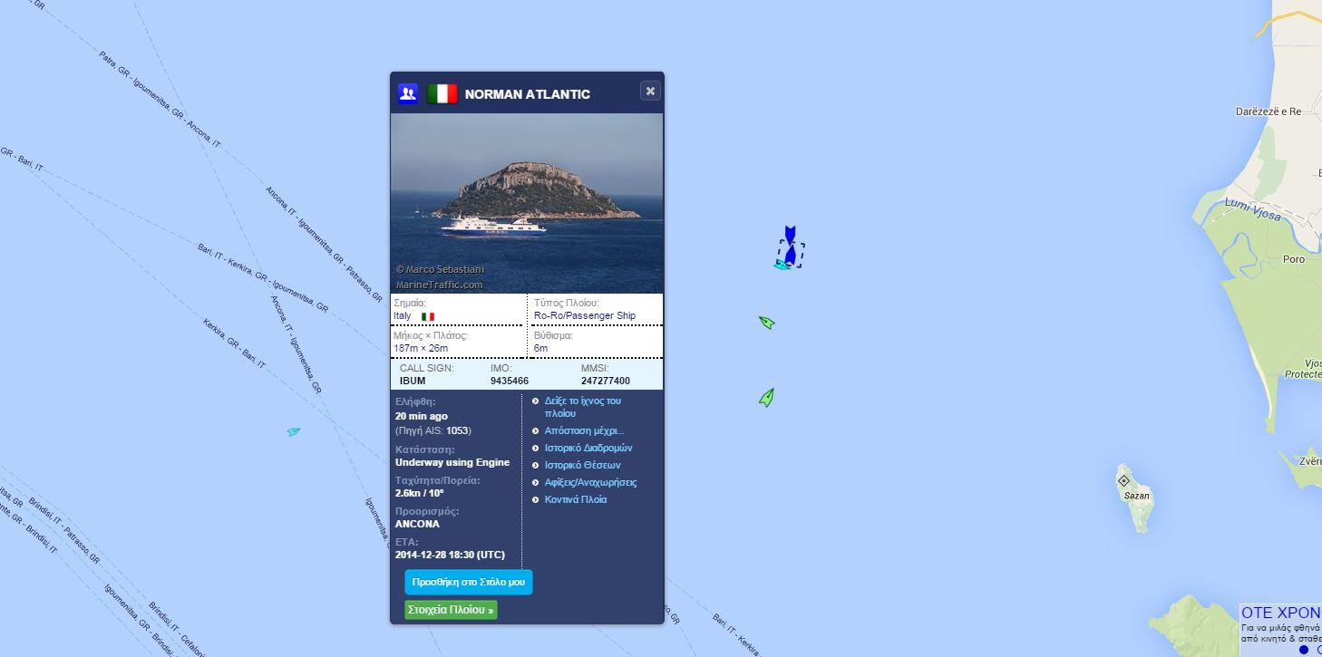 Συναγερμός σήμανε σήμερα στις 4 τα ξημερώματα, 45 ναυτικά μίλια βορειοδυτικά της Κέρκυρας από την εκδήλωση πυρκαγιάς στο επιβατηγό οχηματαγωγό πλοίο Norman Atlantic, που εκτελεί το δρομολόγιο Πάτρα-Ηγουμενίτσα-Ανκόνα. Η πυρκαγιά εκδηλώθηκε στο γκαράζ του πλοίου, ενώ αυτό έπλεε στη θαλάσσια περιοχή 32 ναυτικά μίλια βορειοδυτικά των Οθωνών, με προορισμό την Αγκόνα.