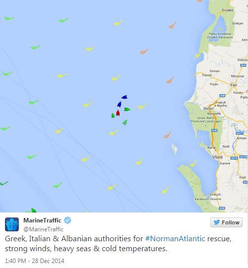 Σημειώνεται ότι το Cruise Εuropa, το οποίο έχει κατεβάσει μια λέμβο, αλλά δεν μπορεί να προσεγγίσει το φλεγόμενο πλοίο. Τα υπόλοιπα πλοία προσπαθούν να δημιουργήσουν προστατευτικό κλοιό, για να περιορίσουν την κακοκαιρία γύρω από το πλοίο και να διευκολύνουν την επιχείρηση απεγκλωβισμού 328 άνθρωποι (σε σύνολο 478 επιβαινόντων) που βρίσκονται ακόμη στο Norman Atlantic.