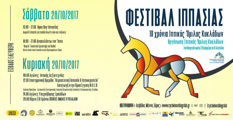 Ο Ιππικός Όμιλος Κυκλάδων εορτάζει τα 10 χρόνια λειτουργίας του τo Σάββατο 28 και την Κυριακή 29 Οκτωβρίου 2017 στις εγκαταστάσεις του. Πρόκειται για τον μοναδικό αναγνωρισμένο Ιππικό Όμιλο από την Ελληνική Ομοσπονδία Ιππασίας και τη Γενική Γραμματεία Αθλητισμού στις Κυκλάδες. Έναν σύλλογο που έφερε διακρίσεις στο νησί της Σύρου, πανελληνιονίκη, πρωταθλητή Ελλάδος και άλλες τόσες νίκες και χαρές.
