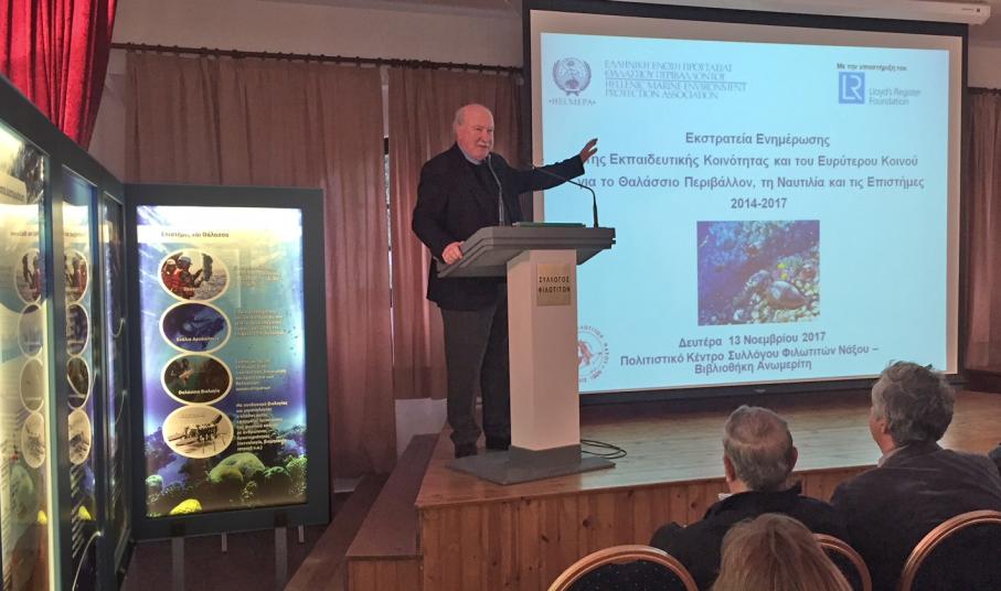 Εκ μέρους της HELMEPA, ο κ. Κ. Τριανταφύλλου παρουσίασε την μέχρι τώρα εξέλιξη της τριετούς Εκστρατείας, που ξεκίνησε το 2014 στον Οργανισμό Λιμένος Πειραιά και κατόπιν επισκέφθηκε κατά σειρά Θεσσαλονίκη, Καβάλα, Αίγινα, Κόρινθο, Λουτράκι, Χίο, Σάμο, Σκιάθο, Πόρο, Αίγιο, Σπάρτη, Κάρυστο και Μαρμάρι, πριν καταλήξει στη Νάξο.