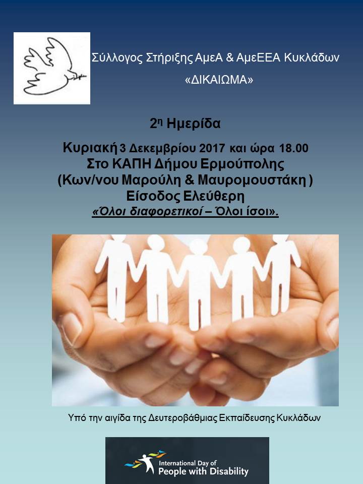 Α. Την Κυριακή 3 Δεκεμβρίου θα γίνει ημερίδα με τίτλο “ΟΛΟΙ ΔΙΑΦΟΡΕΤΙΚΟΙ ΟΛΟΙ ΙΣΟΙ” με τοποθετήσεις ειδικών πάνω σε ζητήματα που αφορούν τα άτομα με αναπηρία και τα άτομα με Εκπαιδευτικές Ανάγκες. Η εκδήλωση θα γίνει στο χώρο του ΚΑΠΗ Ερμούπολης στις 6 μμ Η είσοδος είναι ελεύθερη.