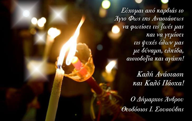 «Ευχόμαστε ολόψυχα στους δημότες της Άνδρου και στους απανταχού Ανδριώτες, το Άγιο Φως της Ανάστασης του Κυρίου να φωτίζει τη ζωή μας και να κρατάει ζωντανή την ελπίδα μας.