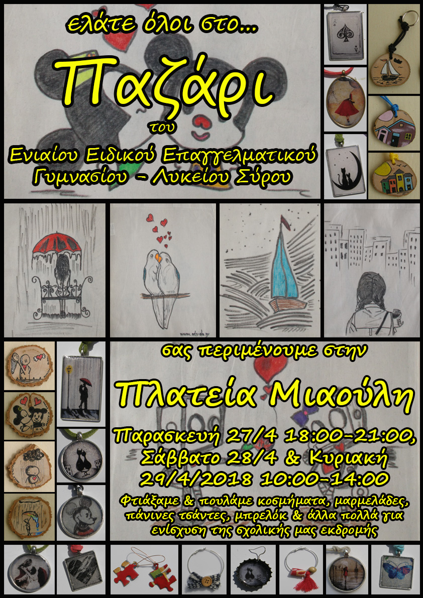 Σας περιμένουμε όλους στο Παζάρι που θα πραγματοποιήσει το σχολείο μας το Παρασκευή 27/04/2018 από τις 18:00-21:00, το Σάββατο 28/04/2018 και την Κυριακή 29/04/2018 από τις 10:00-14:00 στην Πλατεία Μιαούλη. Οι μαθητές του σχολείου μας πωλούν τις δημιουργίες τους, κοσμήματα, πάνινες τσάντες, μαγνητάκια, μπρελόκ, μαρμελάδες και άλλα πολλά με σκοπό να συγκεντρώσουν χρήματα για τη σχολική τους εκδρομή, Θα χαρούμε πολύ να σας δούμε από κοντά.