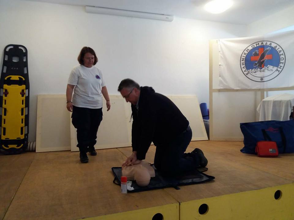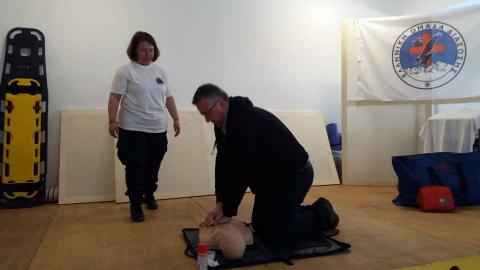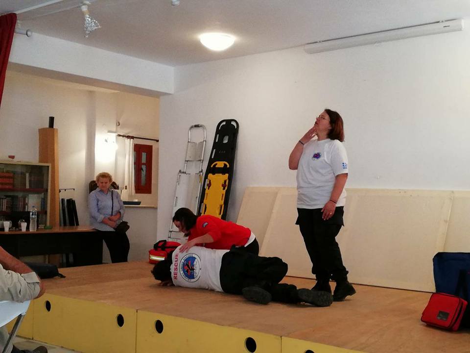 Στη συνέχεια τα Πιστοποιημένα μέλη της ΕΟΔ παρουσίασαν την τεχνική Καρδιοαναπνευστικής Αναζωογόνησης (ΚΑΡΠΑ) με χρήση Αυτόματου Εξωτερικού Απινιδωτή, τη Θέση Ασφαλείας (Ανάνηψης) και τρόπους αντιμετώπισης Πνιγμονής.
