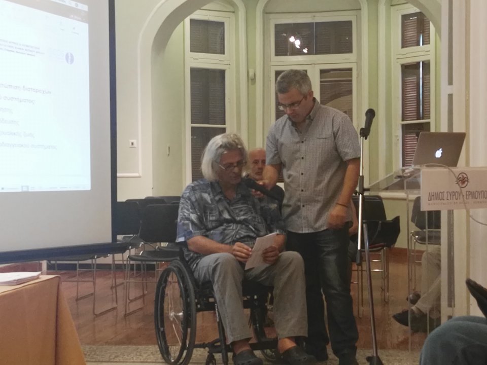 Με την υποστήριξη του Γενικού Νοσοκομείου Σύρου, του Ιατρικού Συλλόγου Κυκλάδων, καθώς και του Δήμου Σύρου – Ερμούπολης έλαβε χώρα μία εξαιρετικά ενδιαφέρουσα ημερίδα στο νησί, με τους εκπροσώπους της Ελληνικής Εταιρείας Φυσικής Ιατρικής και Αποκατάστασης (Τμήμα Μελέτης και Αποκατάστασης Βλαβών Νωτιαίου Μυελού) που είναι και μέλος της Διεθνούς Εταιρείας Νωτιαίου Μυελού ISCOS και συγκεκριμένα του Γιάννη Διονυσιώτη (MD, phD, Ιατρός Φυσικής Ιατρικής και Αποκατάστασης και Διδάκτωρ Πανεπιστημίου Αθηνών) και της Χριστίνας – Αναστασίας Ραπίδη (MD, PhD, Ιατρός Φυσικής Ιατρικής και Αποκατάστασης - Τμήμα ΦΙΑπ. ΓΝΑ “Γ. Γεννηματάς”) να αναπτύσσεται ένας ζωντανός διάλογος με τους συμπολίτες μας που έδωσαν το “παρών”.